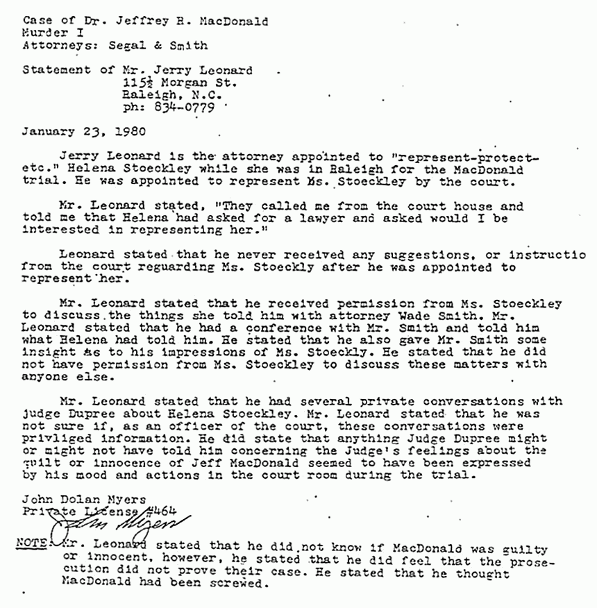Report by John Myers re: statements of Jerry Leonard (attorney for Helena Stoeckley)