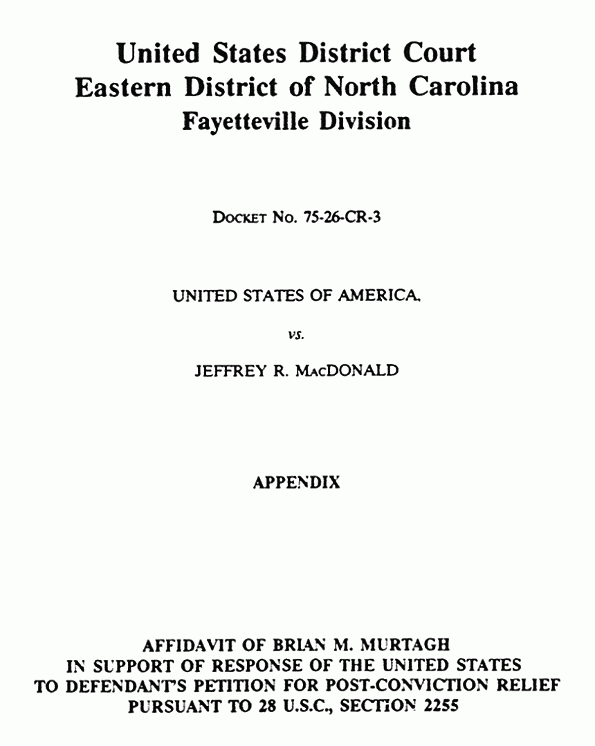 Affidavit of Brian Murtagh in Support of Response of the United States to Jeffrey MacDonald's Petition for Post-Conviction Relief Pursuant to 28 U.S.C., Section 2255, Appendix cover page