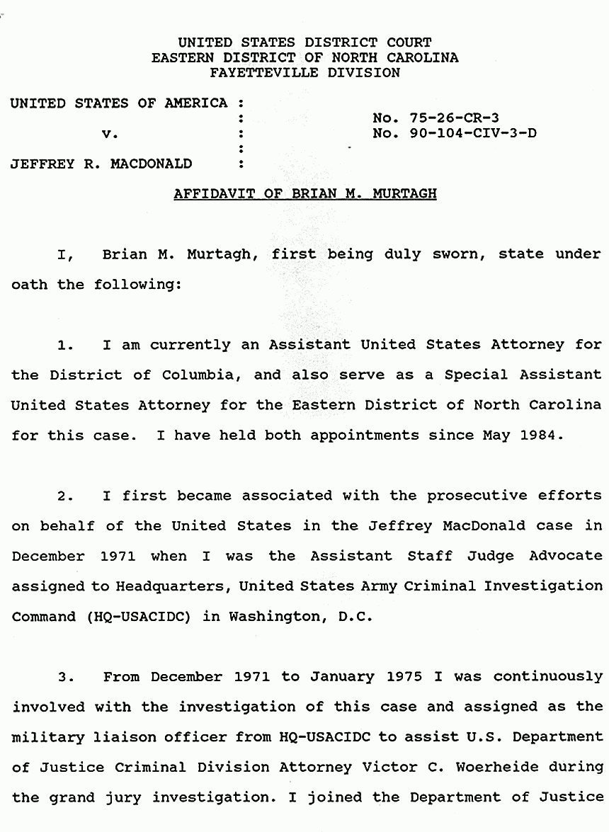 Affidavit of Brian Murtagh in Support of Response of the United States to Jeffrey MacDonald's Petition for Post-Conviction Relief Pursuant to 28 U.S.C., Section 2255,
