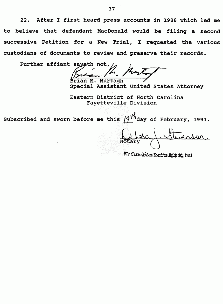 Affidavit of Brian Murtagh in Support of Response of the United States to Jeffrey MacDonald's Petition for Post-Conviction Relief Pursuant to 28 U.S.C., Section 2255