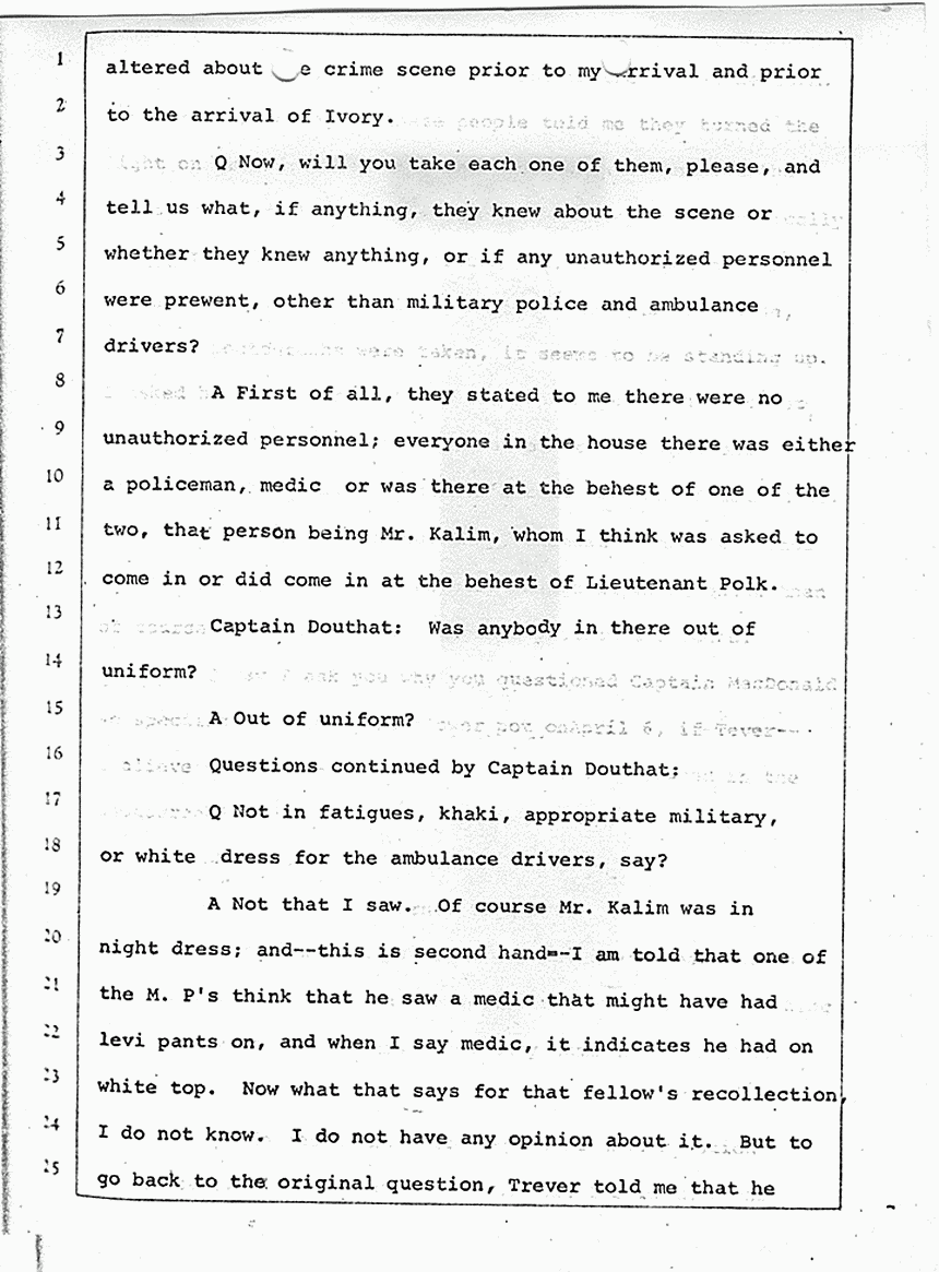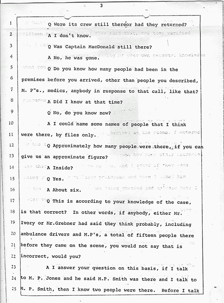 A I have talked to a couple of MPs who say they were in the room, or looked in the room and did something, and by the same token, I know that either Ivory or Grebner or other investigators have talked to other MPs who say that they looked in the room and stepped in the room and flashed a light in the bed; so from what I have been told and personal knowledge, is the way I answer this question. Now I know that after I arrived, from personal knowledge, no one disturbed this scene between that time and the time the pictures were taken.