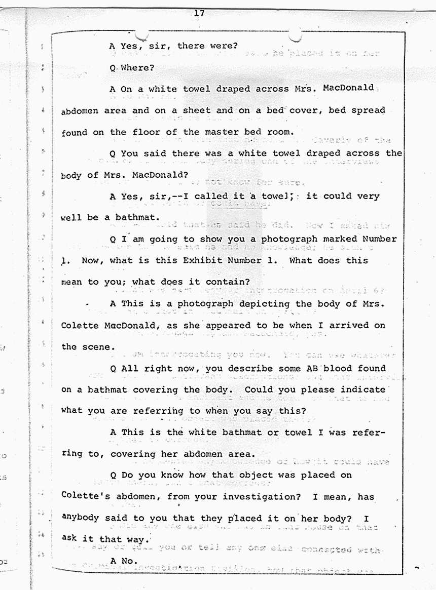 A Well, this picture was exposed on 17 February, by Mr. Squires from the Post Photo Lab, and it depicts the body of Kimberly MacDonald in place as it was found by me from the north side of the bed. It shows this particular portion of the bed and room before it was disturbed in any manner by investigators, medics or anyone else coming on the scene.