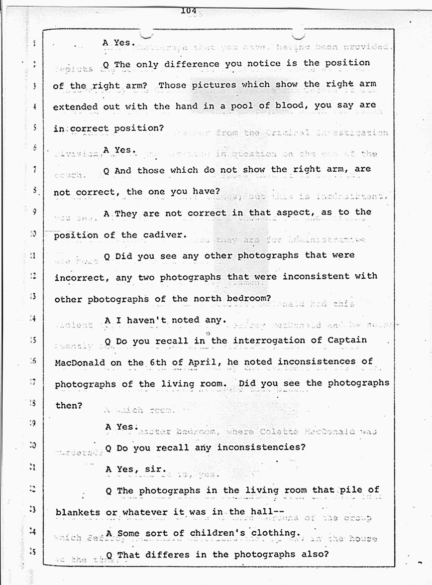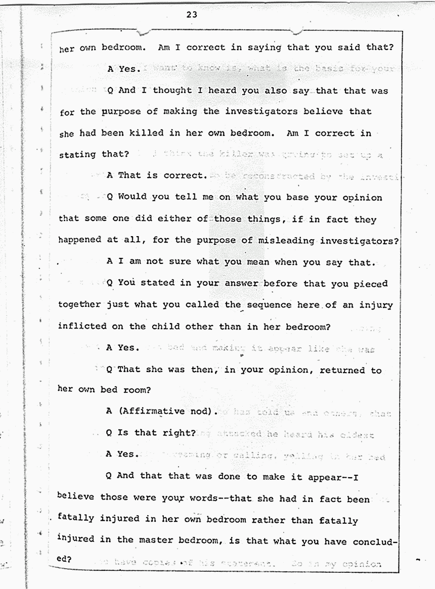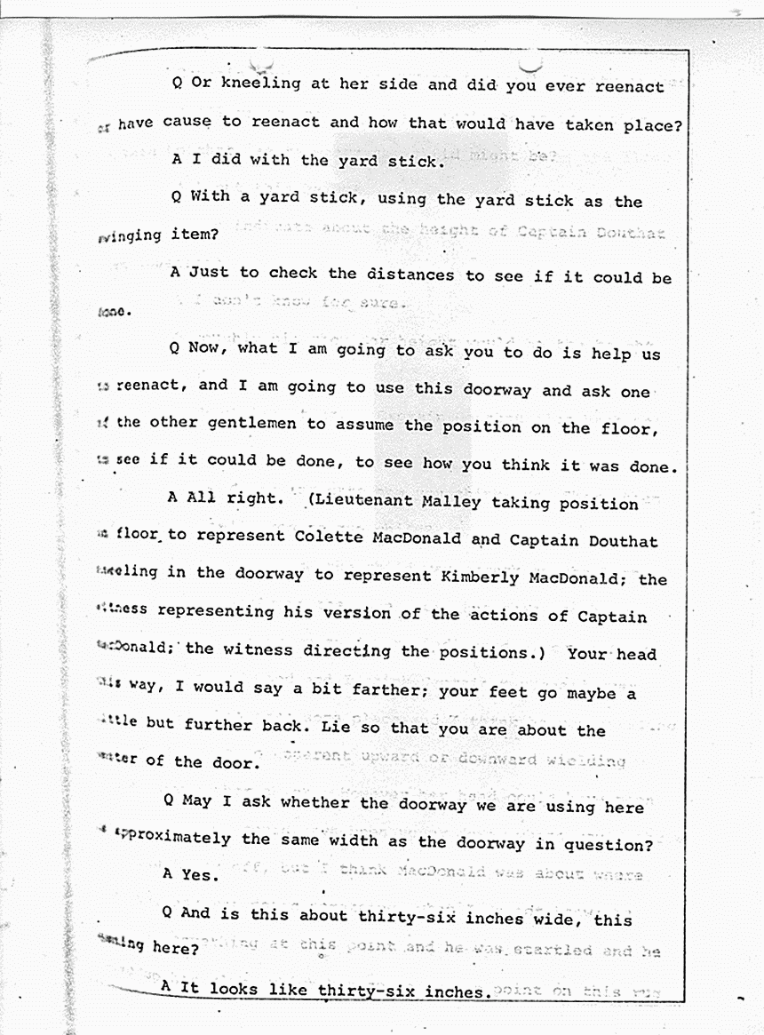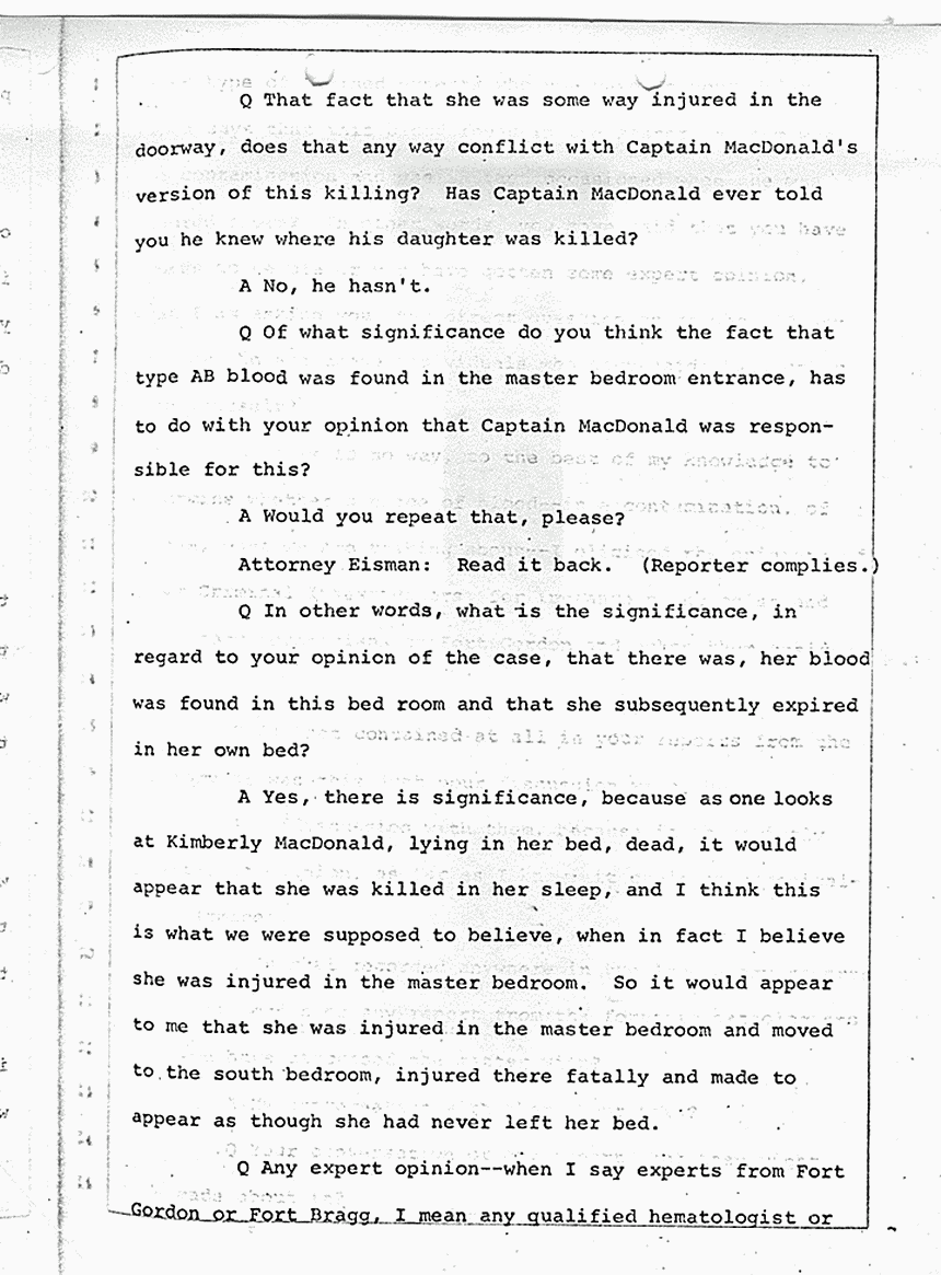 Q In your opinion, then, Colette attacked the child in the north bedroom and again, you feel that Captain MacDonald possibly saw this or came in and became enraged because he saw this and thereupon attacked Mrs. MacDonald, is that correct?