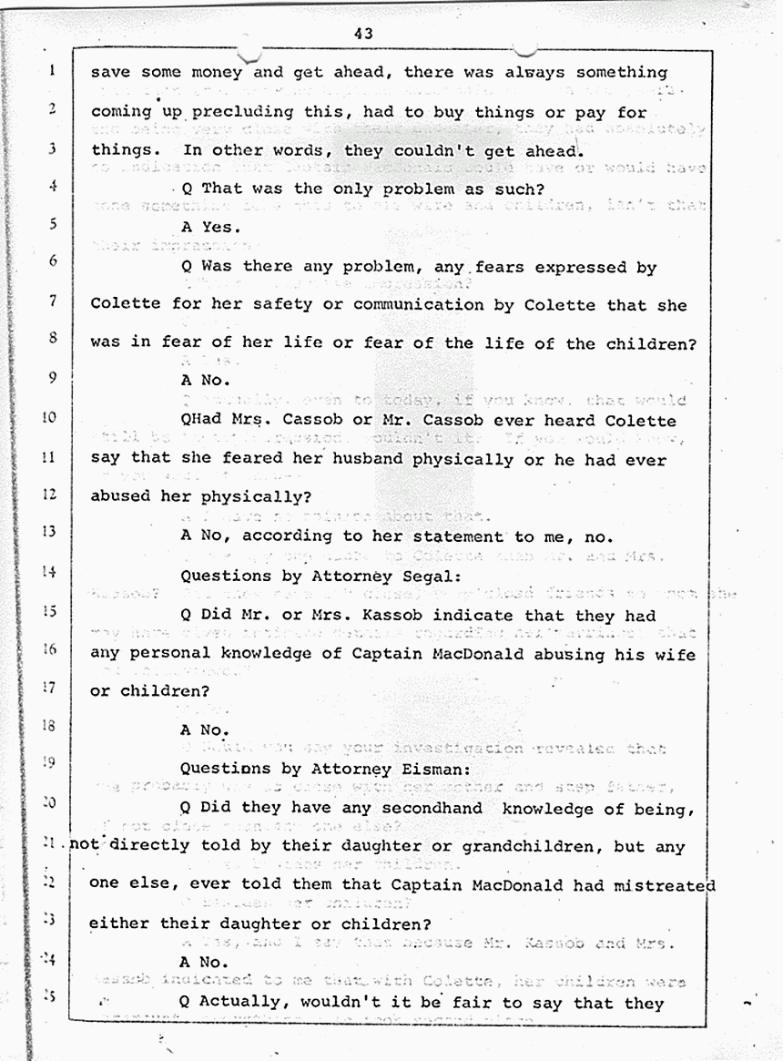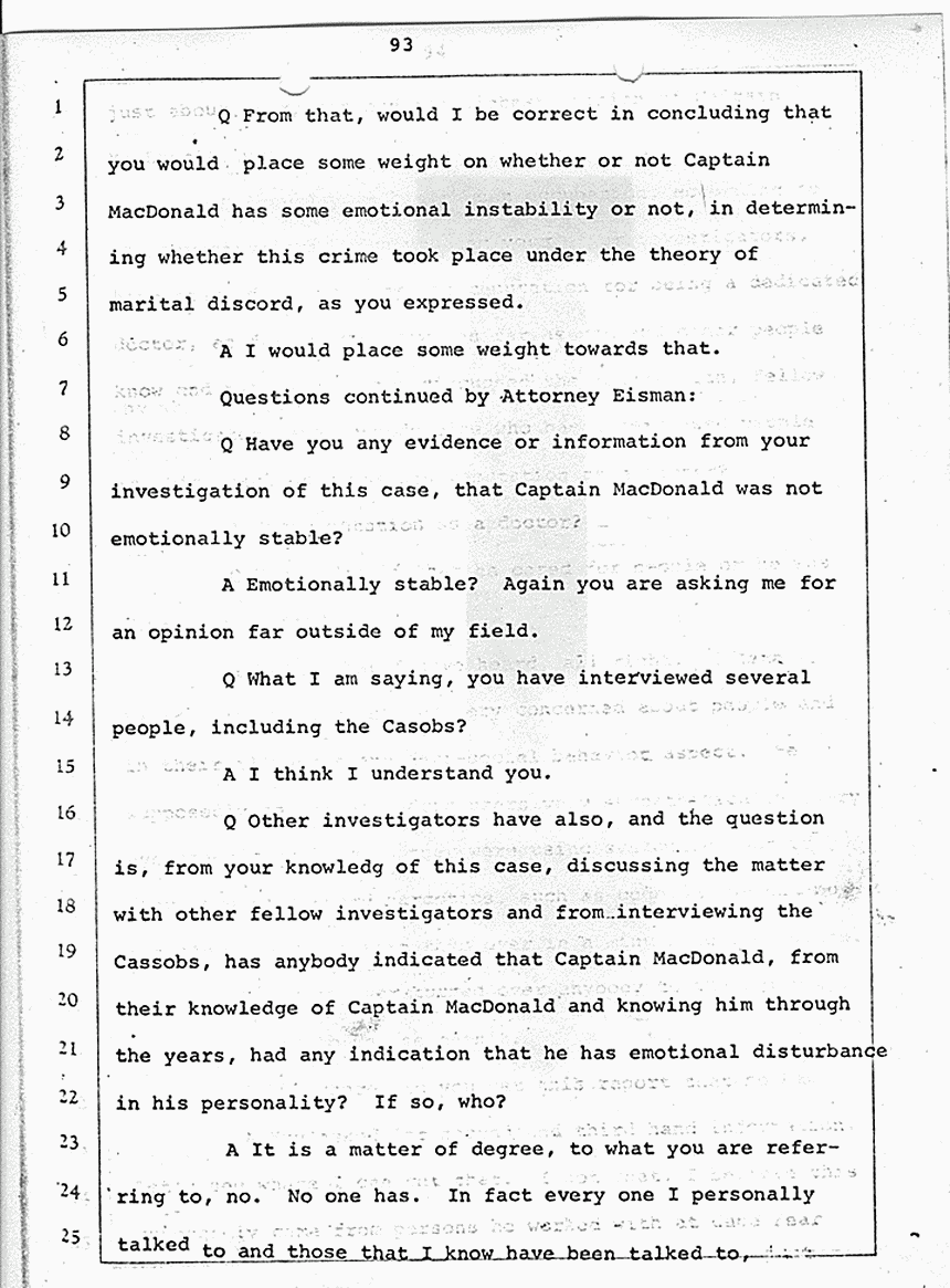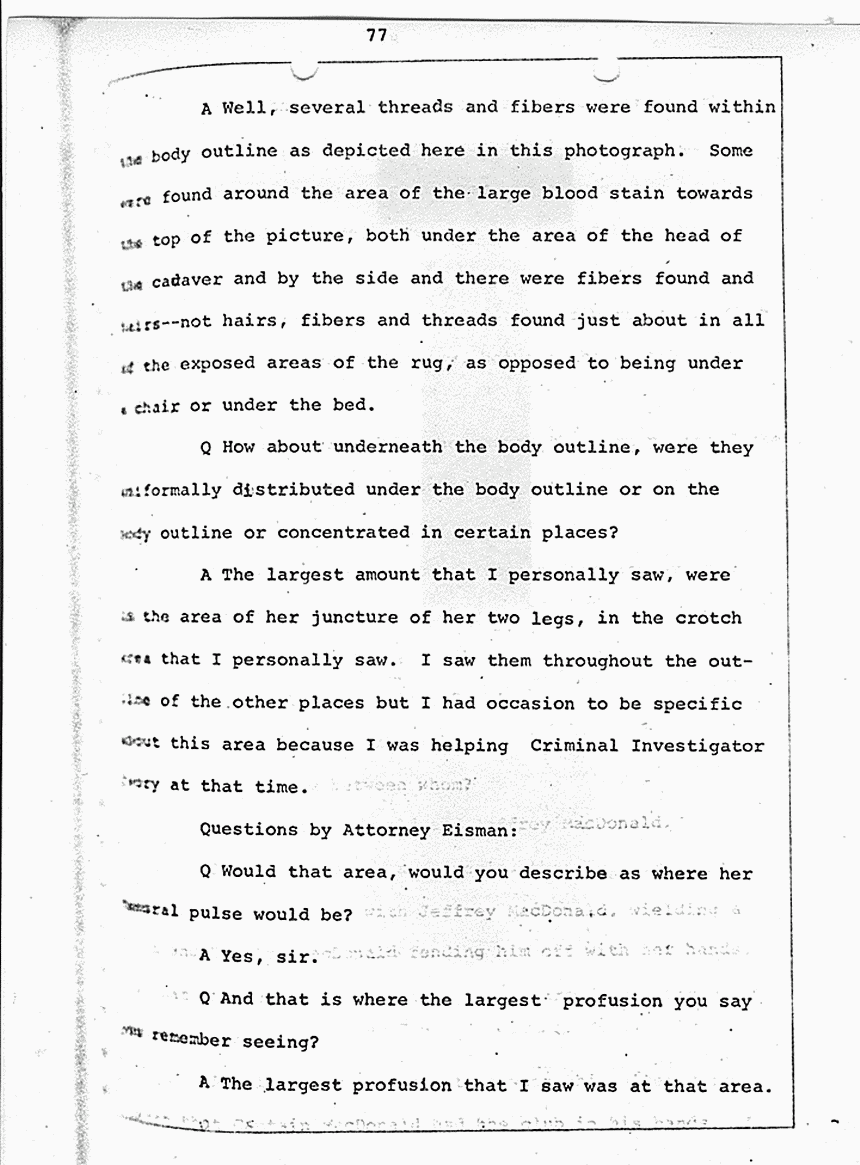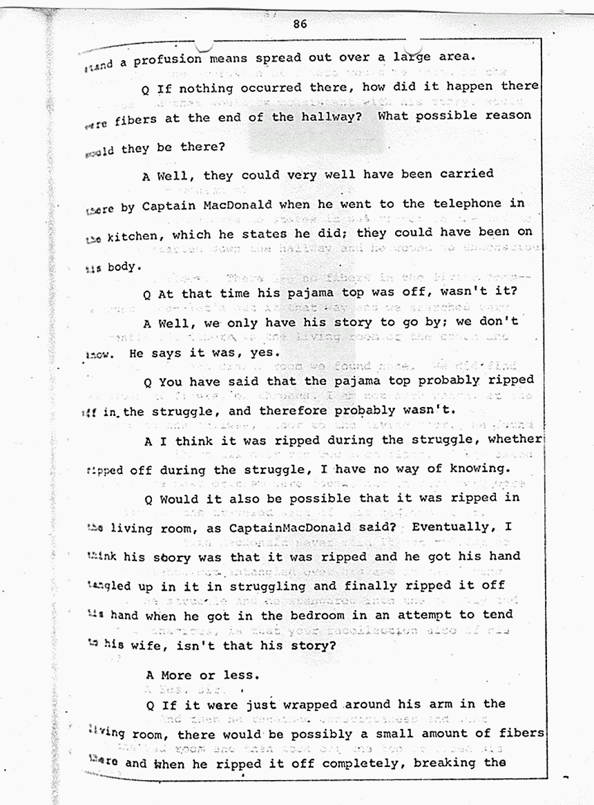 Q In your opinion, then, Colette attacked the child in the north bedroom and again, you feel that Captain MacDonald possibly saw this or came in and became enraged because he saw this and thereupon attacked Mrs. MacDonald, is that correct?