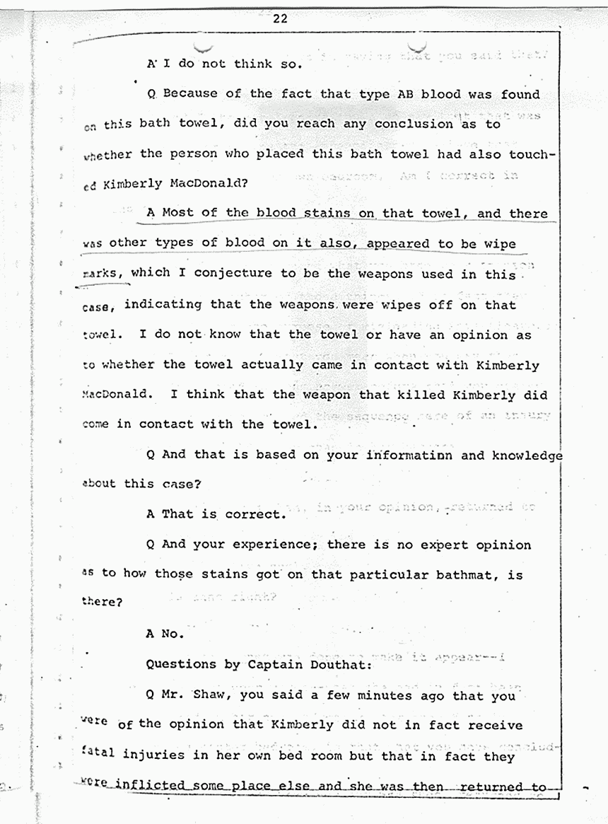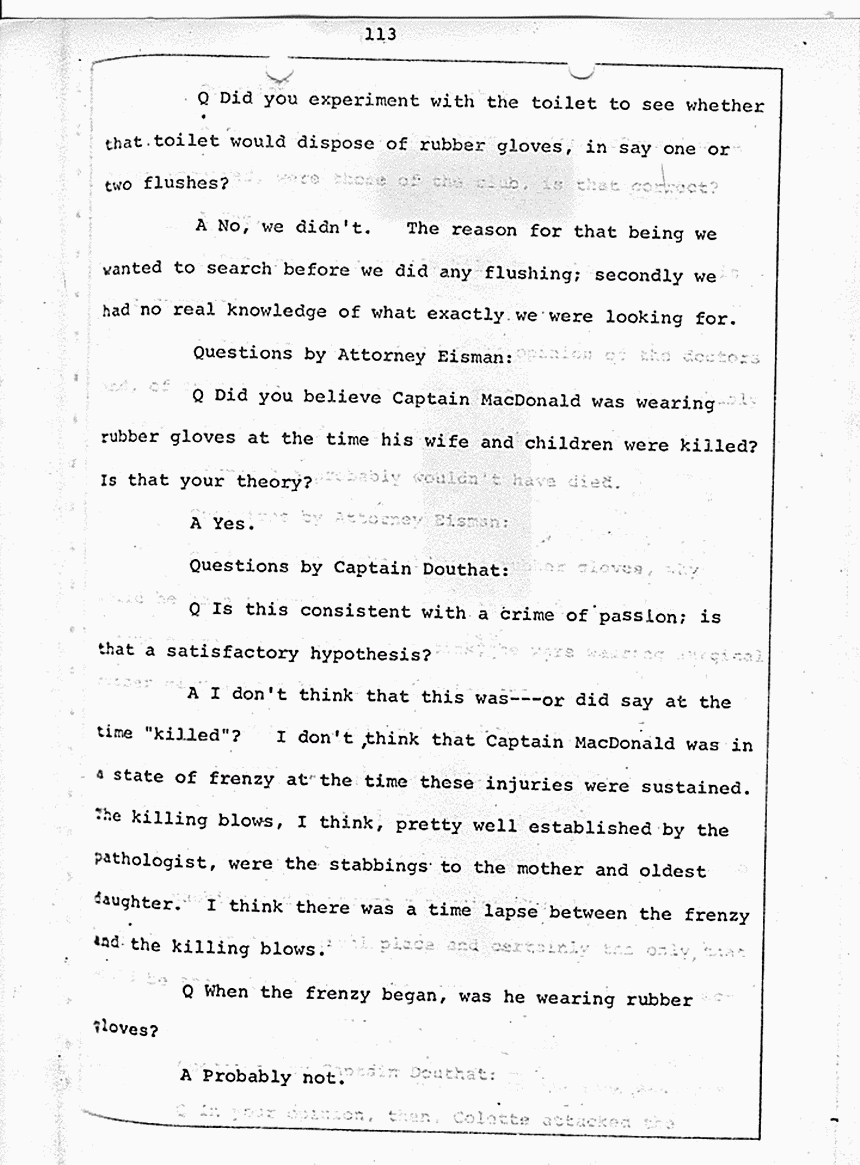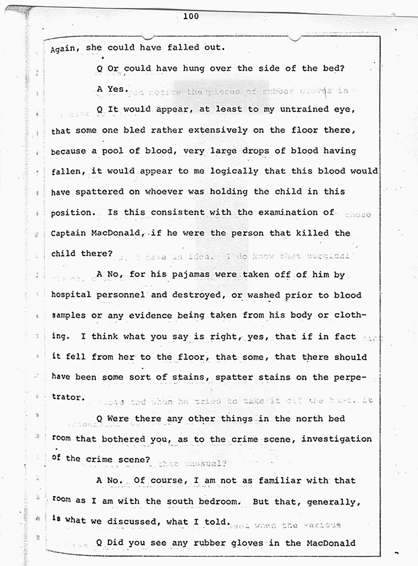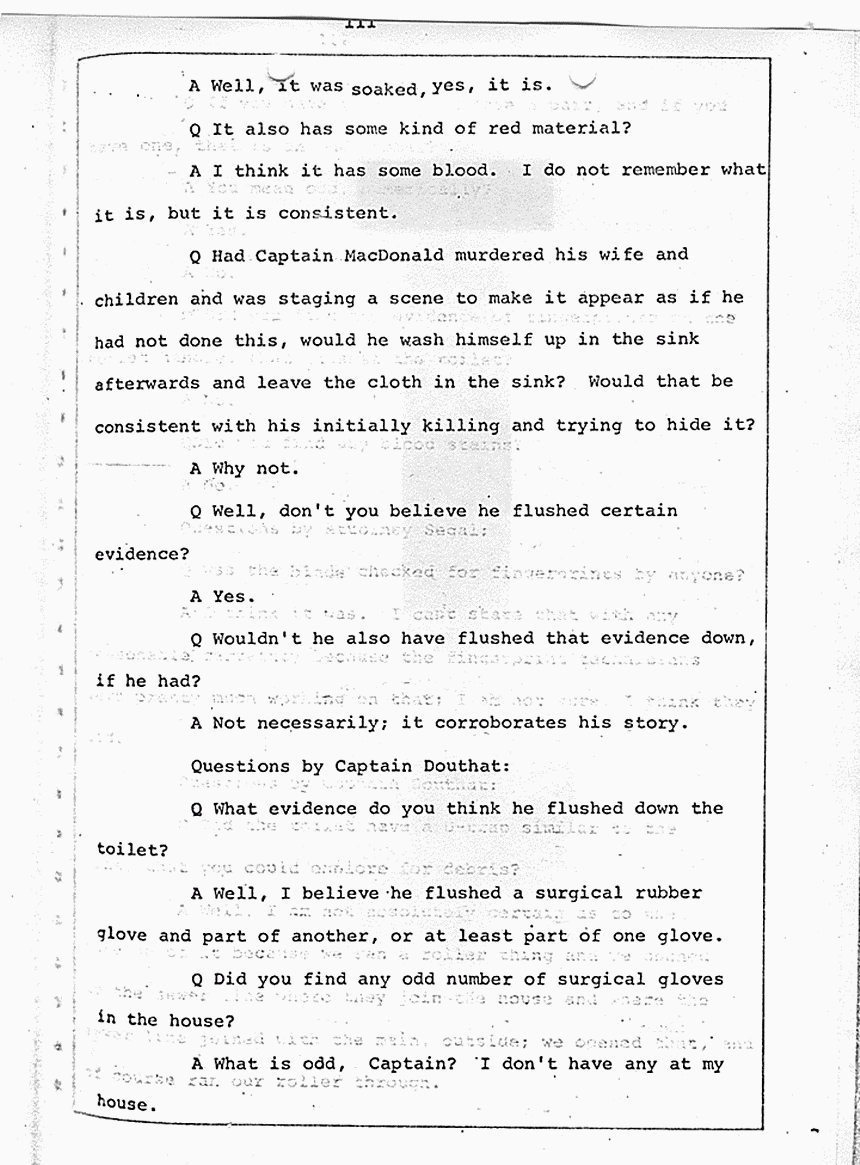 Q If Captain MacDonald wore rubber gloves, why would he have to wash his hands in the sink and leave tissue there with blood in the sink, if he were wearing surgical rubber gloves when he was inflicting the wounds?