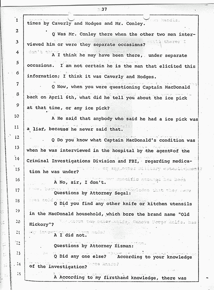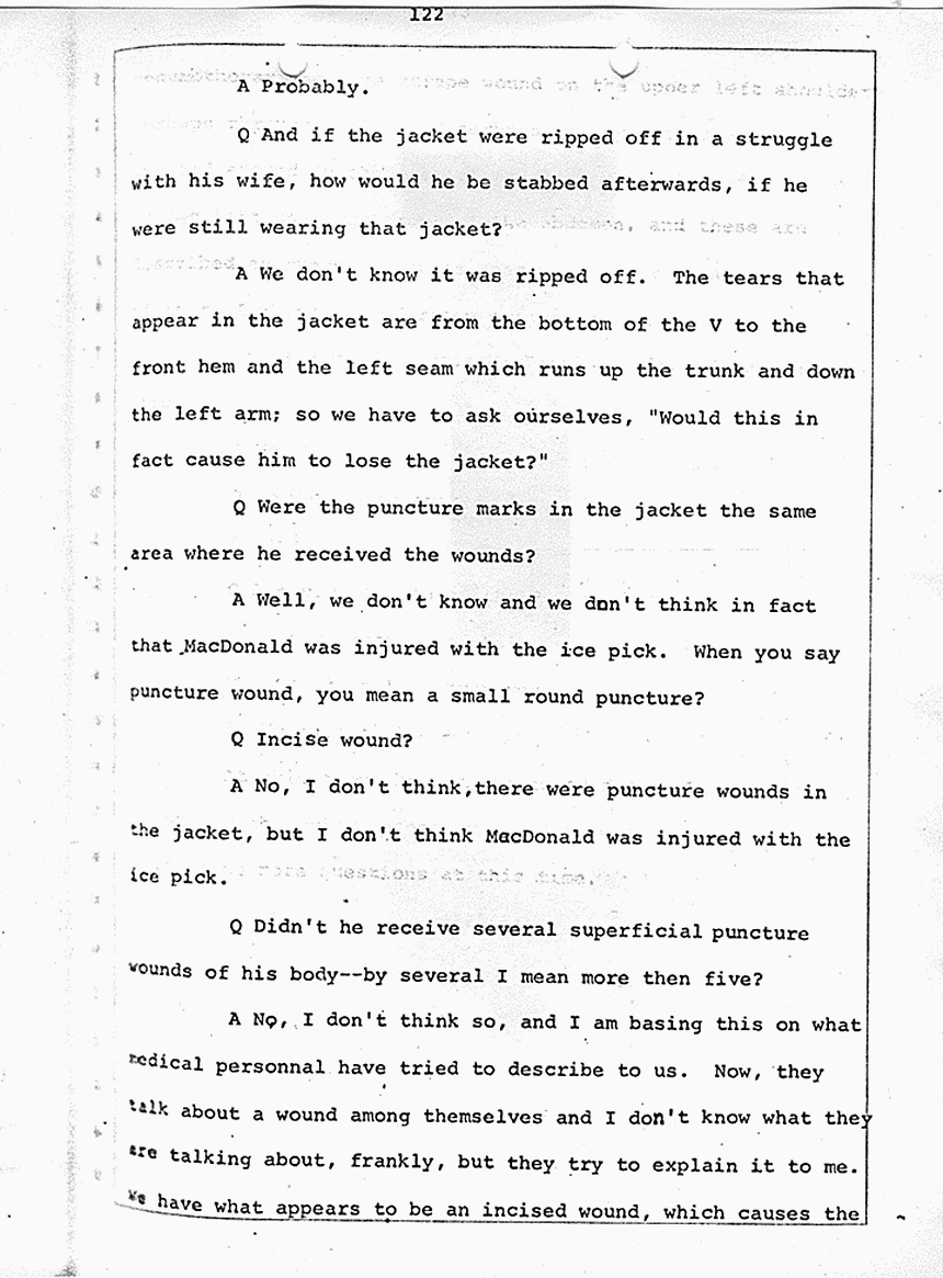 A No, I don't think, there were puncture wounds in the jacket, but I don't think MacDonald was injured with the icepick.