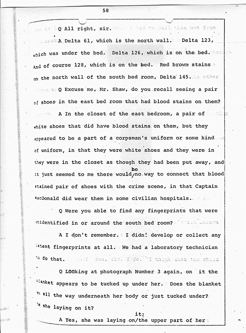 A Well, this is again a photograph of the body of Kimberly MacDonald, exposed from the position of the camera would be the southeast corner of the bed. Again, this picture was taken before anything was moved in that room.