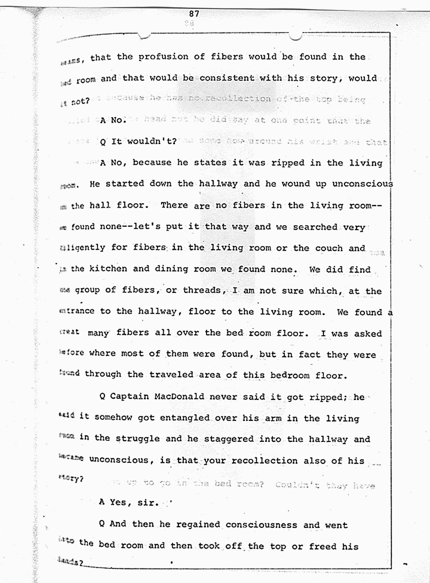 Q In other words, you believe all three of the deceased MacDonalds were rendered probably unconscious prior to the time Captain MacDonald obtained the rubber gloves or any other instrument, other than the club?