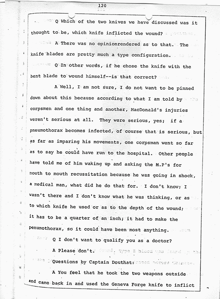 A Well, I am not sure, I do not want to be pinned down about this because according to what I am told by corpsmen and one thing and another, MacDonald's injuries weren't serious at all. They were serious, yes; if a pneumothorax becomes infected, of course that is serious, but as far as impairing his movements, one corpsman went so far as to say he could have run to the hospital. Other people have told me of him waking up and asking the MPs for mouth-to-mouth resuscitation because he was going in shock; a medical man, what did he do that for? I don't know; I wasn't there and I don't know what he was thinking, or as to which knife he used or as to the depth of the wound; it has to be a quarter of an inch; it had to make the pneumothorax, so it could have been most anything.
