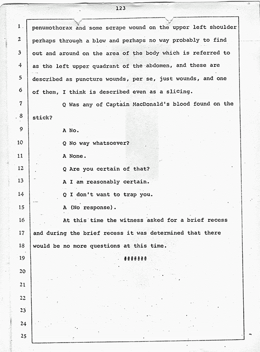 A Well, we don't know and we don't think, in fact, that MacDonald was injured with the icepick. When you say puncture wound, you mean a small, round puncture?