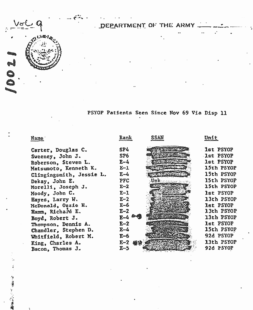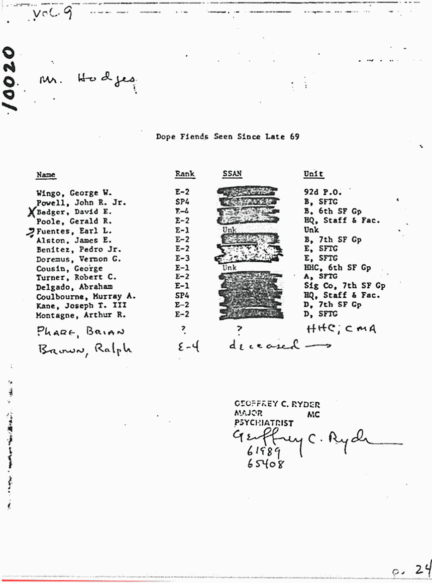 Lists compiled by Major Geoffrey Ryder (Army psychiatrist): "PSYOP Patients Seen Since Nov. 1969" and "Dope Fiends Seen Since Late 69"