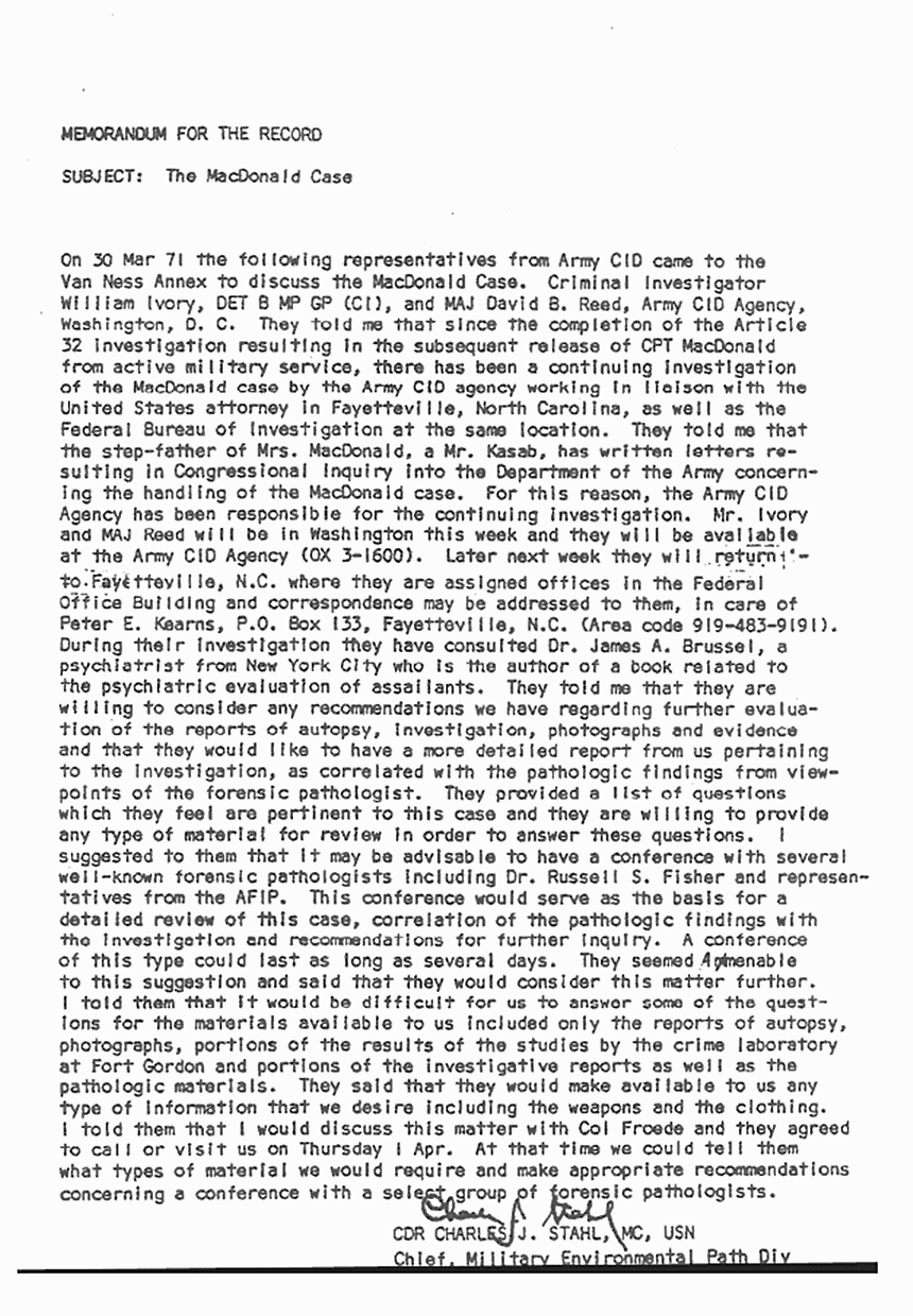 Memo from CDR Charles Stahl re: the MacDonald murders