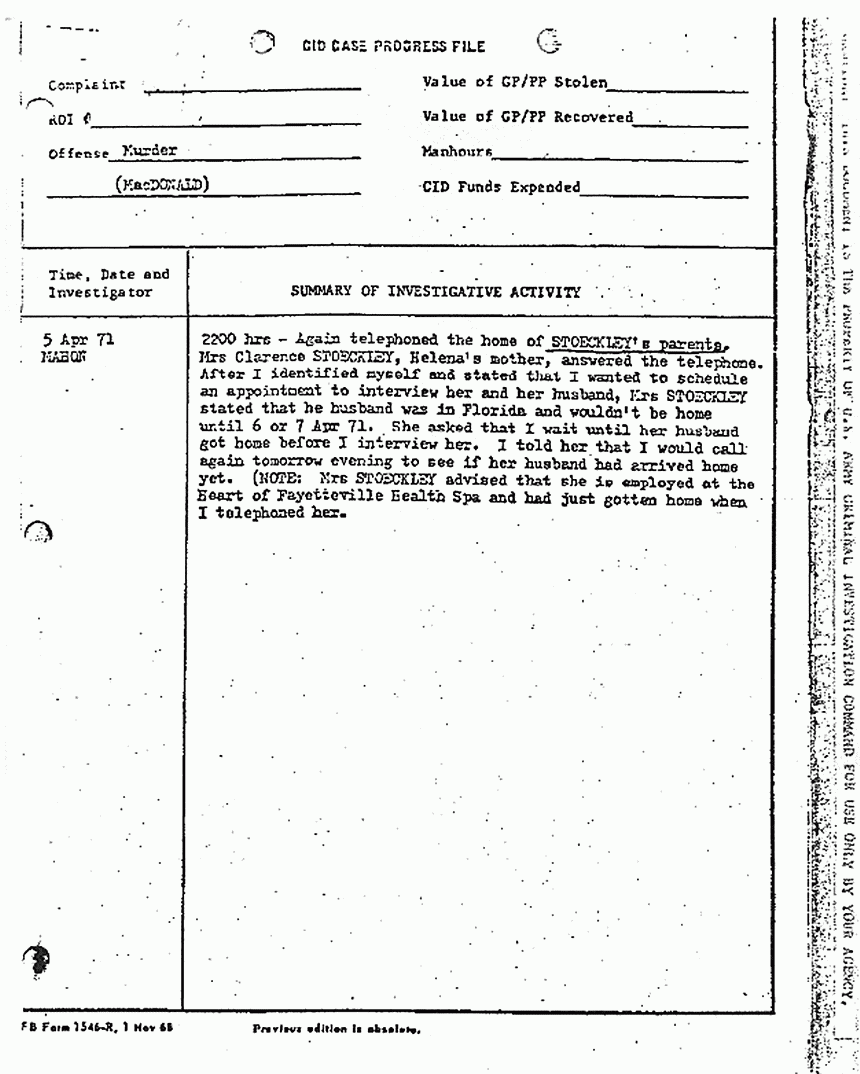 Case Progress File re: contacting Mr. and Mrs. Clarence Stoeckley