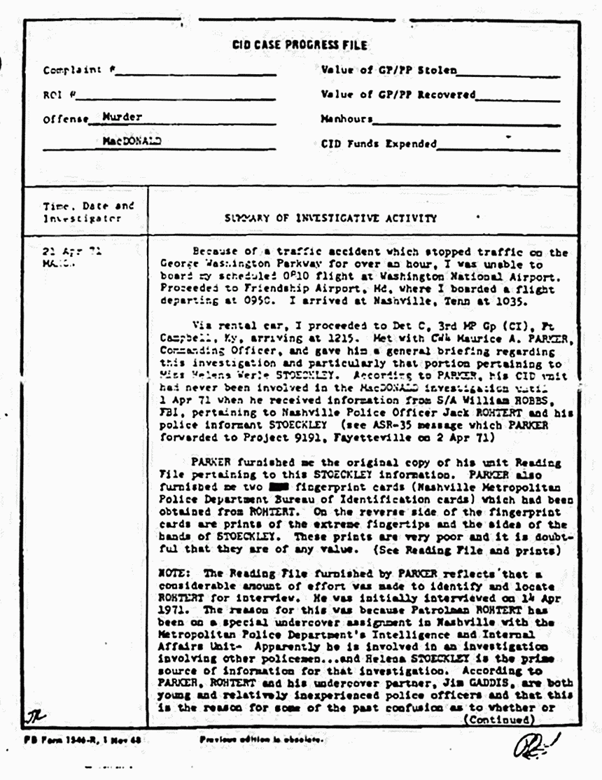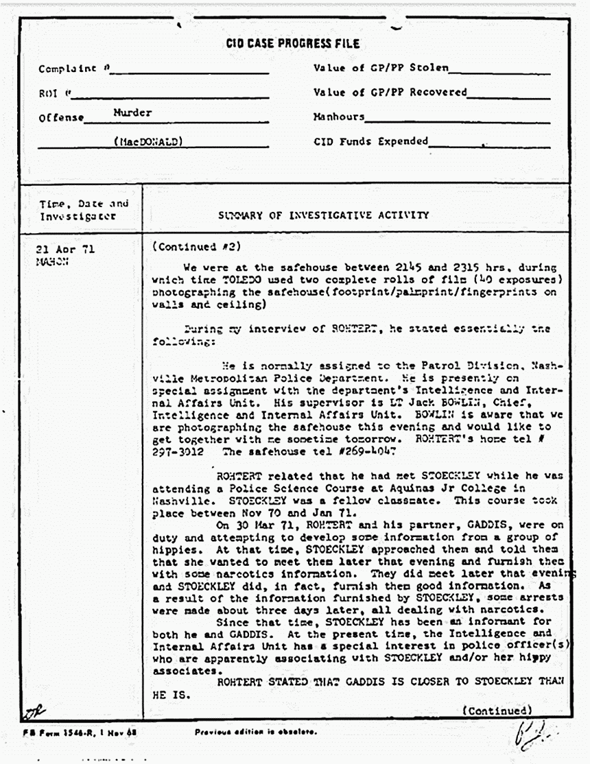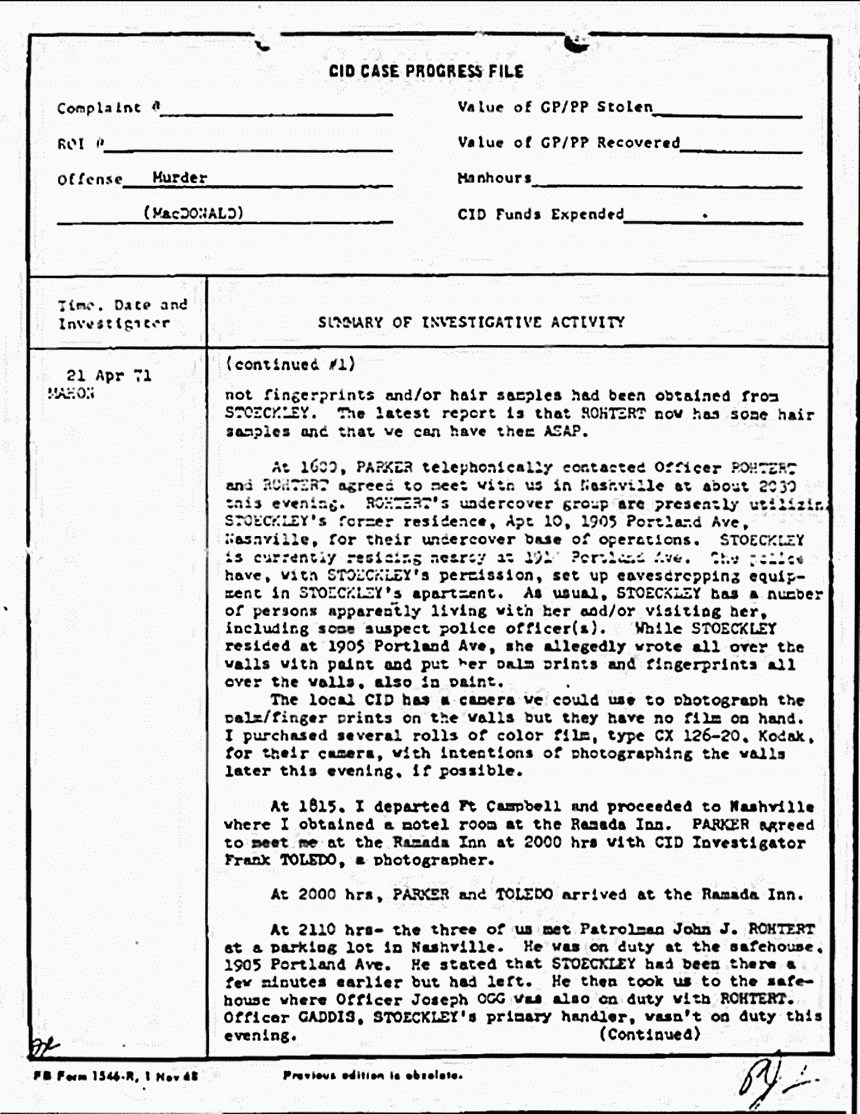 | April 21, 1971: | Notes re: photographs taken by Frank Toledo (CID) of prints found at 1910 Portland Avenue, Nashville, TN (Helena Stoeckley's apartment) |
