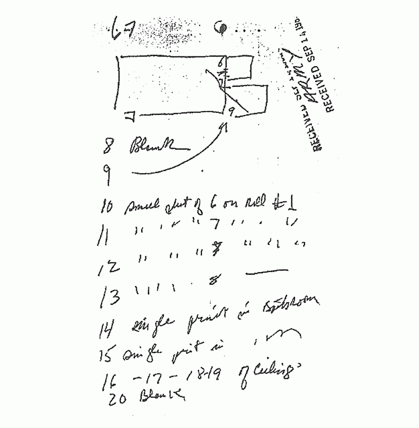 Notes re: photographs taken by Frank Toledo (CID) of prints found at 1910 Portland Ave., Nashville, TN (Helena Stoeckley's apartment)