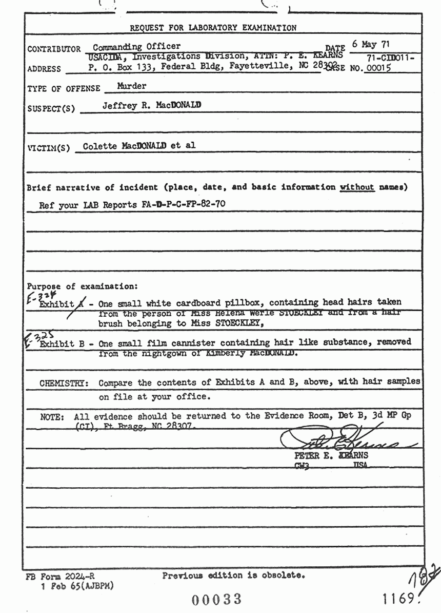 May 6-25, 1971: Notes, worksheets and lab reports re: CID chemist Janice Glisson's examinations of hair samples, p. 1 of 10
