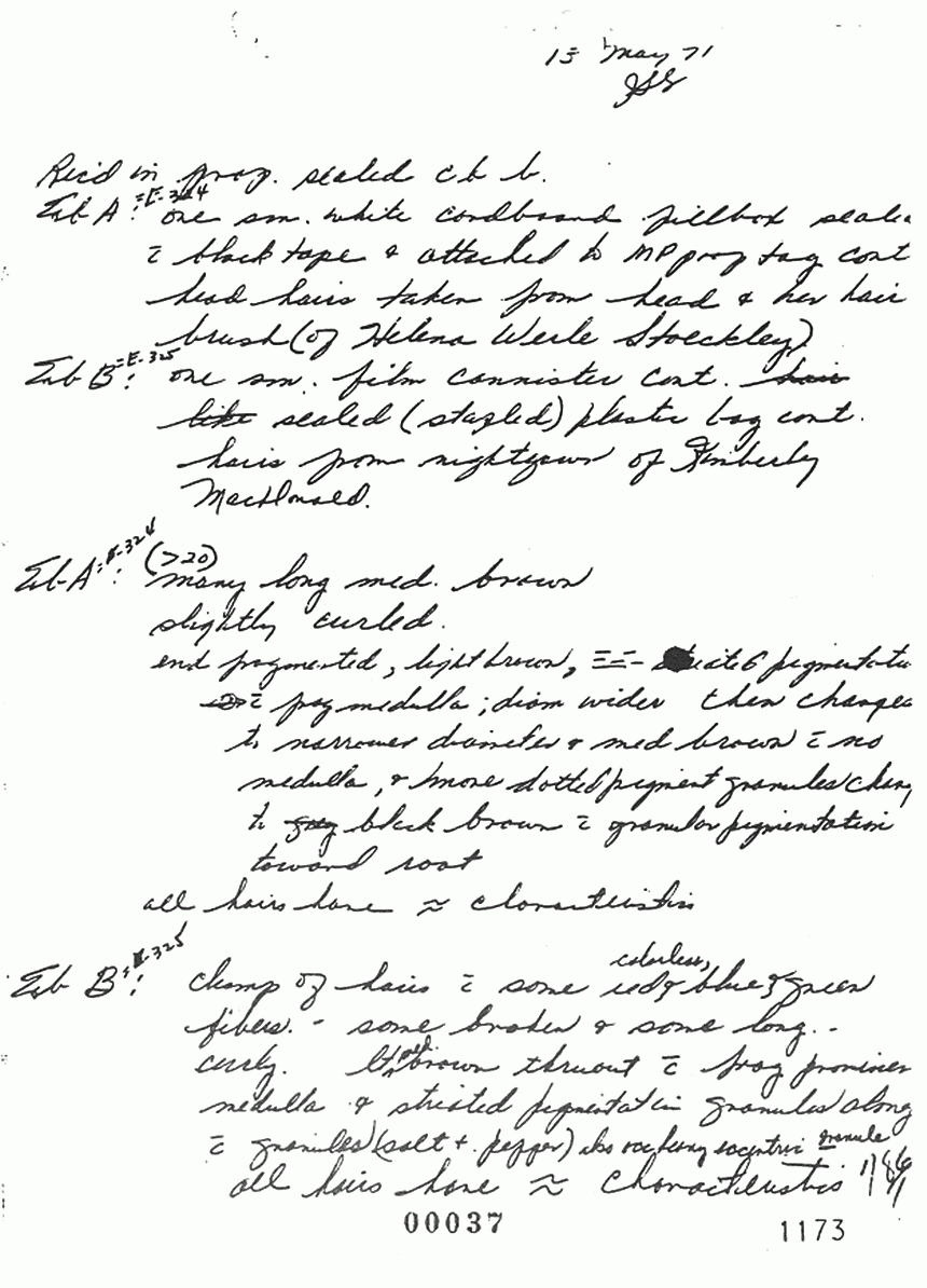 May 6-25, 1971: Notes, worksheets and lab reports re: CID chemist Janice Glisson's examinations of hair samples, p. 3 of 10