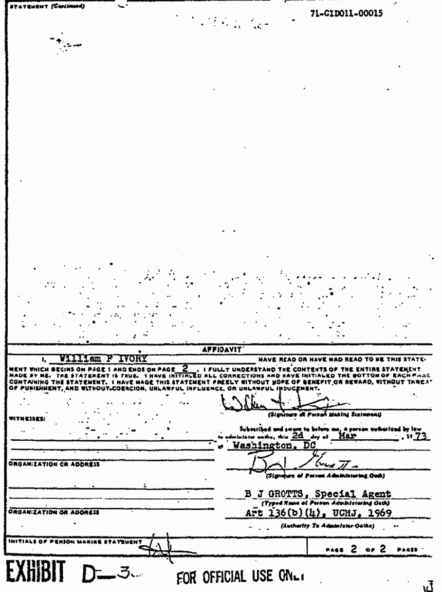 Statement of William Ivory re: his lab observations ca. Feb. 25, 1970