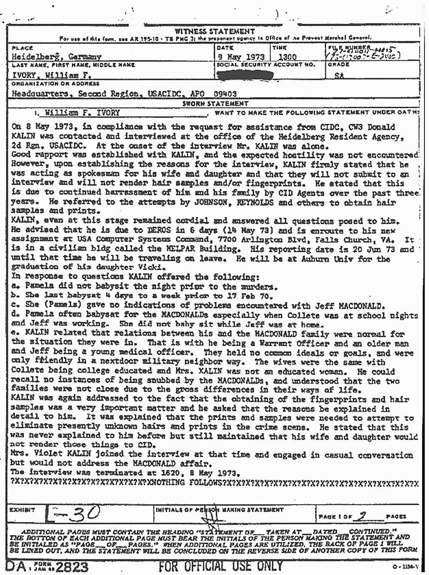 Statement of William Ivory re: Interview of Donald Kalin