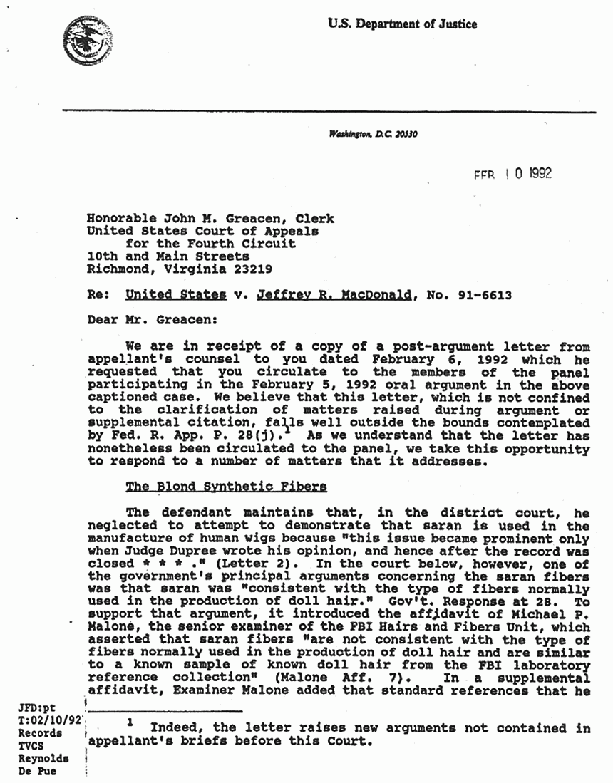 Feb. 6, 1992: | U. S. Court of Appeals for the Fourth Circuit Letter from Harvey Silverglate and Alan Derschowitz to the Honorable John Graecen, Clerk |
