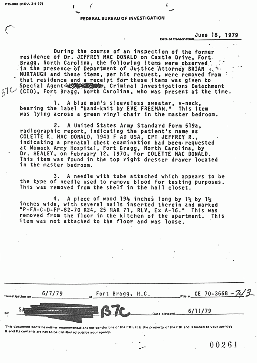FBI Lab Reports re: Microscopic Analysis and Return of man's blue sweater found in master bedroom June 7, 1979