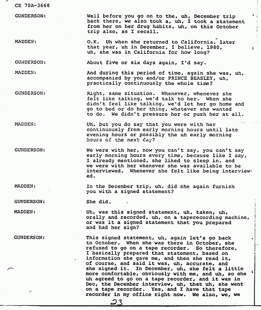 GUNDERSON: This signed statement, uh, again let's go back to October. When she was there in October, she refused to go on a tape recorder. So therefore, I basically prepared that statement, based on information she gave me, and then she read it, of course, and said it was, uh, accurate, and she signed it. In December, uh, she felt a little more comfortable, obviously with me, and uh, so she uh agreed to go on a tape recorder, and it was in Dec, the December interview, uh, that uh, she went on a tape recorder. Yes, and I have that tape recorder in my office right now. We also, we, we then reduced that recording to the form of a signed statement which is a fifty-three page, uh, document, and she read it, initialed each page, and said that it was accurate.