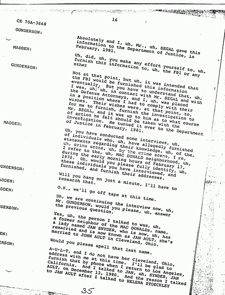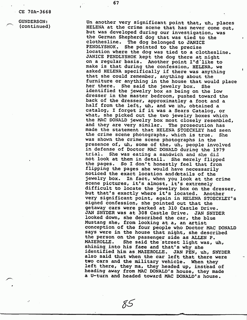 GUNDERSON: O.K., uh, basically there is information in HELENA STOECKLEY's signed confession that I feel is very significant and that has been corroborated through independent investigation, and I don't need to go into a lot of detail, because as I said they're all in the report. But JIMMY FRYERS's telephone call to the house that night in which HELENA admitted in her statement that she answered the phone, JIMMY's prior statement and HELENA's statement are almost identical as to what transpired during the conversation. The hobbyhorse which has been discussed and rediscussed by all, in all areas and by many people involved in the investigation, and also by defense and prosecution, uh, in that when HELENA gave us a confession she said that she tried to ride the hobbyhorse, she couldn't the spring was broken. Uh, we took her to a polygraph operator and one of the questions he asked her was did you see, and of course the prosecution claims she saw the photograph in the newspaper, that's why that is not a significant point, but the polygraph operator asked her did you see the photograph in the Fayetteville paper, uh, that uh, showed the hobbyhorse. And she said in the polygraph examination she did not see it and the polygraph examiner says that based on his analysis she was telling the truth when she said she did not see it. Now if you've ever seen this photograph, and looked at it, you can tell, you cannot tell, I emphasize you cannot tell the spring is broken by looking at the photograph. Uh another very significant point that, uh, places HELENA at the crime scene that has never come out, but was developed during our investigation, was the German Shepherd dog that was tied to the clothesline. The dog belonged to JANICE PENDLYSHOK. She pointed to the precise location where the dog was tied to a clothesline. JANICE PENDLYSHOK kept the dog there at night on a regular basis. Another point I'd like to make is that during the confession, HELENA, we asked HELENA specifically if there was anything that she could remember, anything about the furniture or anything in the house that would place her there. She said the jewelry box. She identified the jewelry box as being on the low dresser in the master bedroom, pushed toward the back of the dresser, approximately a foot and a half from the left, uh, and we uh, obtained a catalog, I forget if it was a Sears Catalog, or what, she picked out the two jewelry boxes which the MACDONALD jewelry box most closely resembled, and they are very similar. The prosecution has made the statement that HELENA STOECKLEY had seen the crime scene photographs, which is true. She was shown the crime scene photographs in the presence of, uh, some of the, uh, people involved in defense of Doctor MACDONALD during the 1979 trial. She was eating a sandwich and she did not look at them in detail. She merely flipped the pages. So I don't honestly feel that from flipping the pages she would have necessarily noticed the exact location and details of the jewelry box. In fact, when you look at the crime scene pictures, it's almost, it's extremely difficult to locate the jewelry box on the dresser, but that's exactly where it's located. Another very significant point, again in HELENA STOECKLEY's signed confession, she pointed out that the getaway cars were parked at 310 Castle Drive. JAN SNYDER was at 308 Castle Drive. JAN SNYDER looked down, she described the car, the blue Mustang she, from looking at a, an artist conception of the four people who Doctor MACDONALD says were in the house that night, she described the person on the passenger side as ALLEN P. MAZEROLLE. She said the street light was, uh, shining into his face and that's why she identified him as, MAZEROLLE. JAN PEN, uh, SNYDER also said that when the car left that there were two cars and the military vehicle. When they left there, they ma, they headed up, instead of heading away from MACDONALD's house, they made a U-turn and headed toward MACDONALD's house. HELENA STOECKLEY has made the same statement, had made the same statement to us about the car making a U-turn and going back toward the MACDONALD house. Uh, we asked HELENA about the hair strands that were found in COLETTE's right hand. Uh, as I recall, this is from memory, not, so I can't say for sure, but, and I believe, I know this is in my report, our report, uh, she told us, uh, BRUCE, she thought it was BRUCE FOWLER, but before earlier she told, she had told PRINCE that she thought it was GREG MITCHELL, and she made the statement to, uh, PRINCE BEASLEY, that uh she saw GREG MITCHELL, uh, on top of COLETTE, struggling with COLETTE, but one of the areas, this, this concerns me because it seems to me like, uh, somebody should, uh, attempt to locate these people and compare the hair strands found in COLETTE's hand with the, uh, known specimens of these various suspects. Uh, basically, uh, I feel that these points uh, along with HELENA's statements tie her into the, at the crime scene. There's some other points in the investigation which I think are very significant. For instance, the artist conception furnished by Doctor MACDONALD. Uh, these are actual live people. I don't know where the Government feels or thinks that possibly Doctor MACDONALD could have invented these, these faces. He gave these artist conceptions hours after the crimes were committed. Also, there are seventeen fingerprints and fourteen palm prints that have never been identified from the crime scene. It seems to me like somebody should attempt to, uh, compare the, uh, fingerprints of these suspects who have been named with those prints that are still, I assume, in evidence. Uh, another significant point, again this did not necessarily relate to HELENA's signed confession, but it's significant to note, uh, three people saw the black male with E-6, six stripes that night, BEASLEY, Doctor MACDONALD, and one of our informants who, uh, we have developed during the investigation. Uh,
