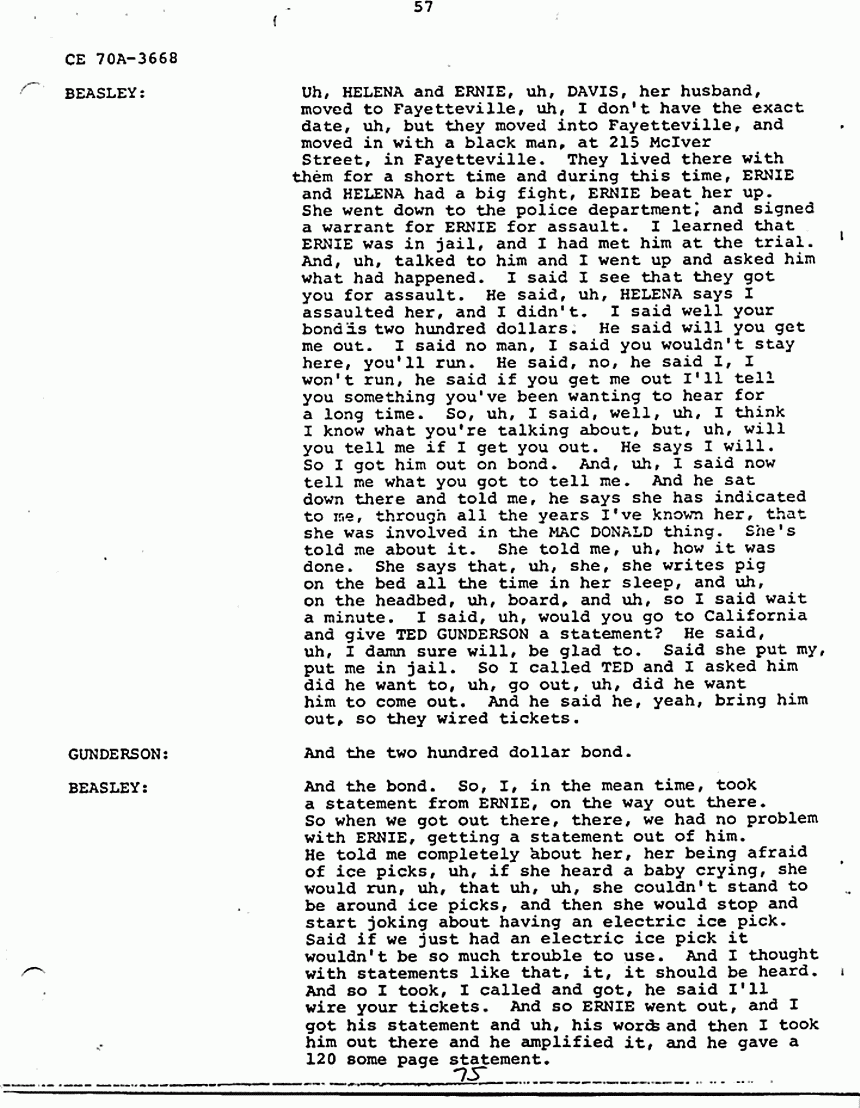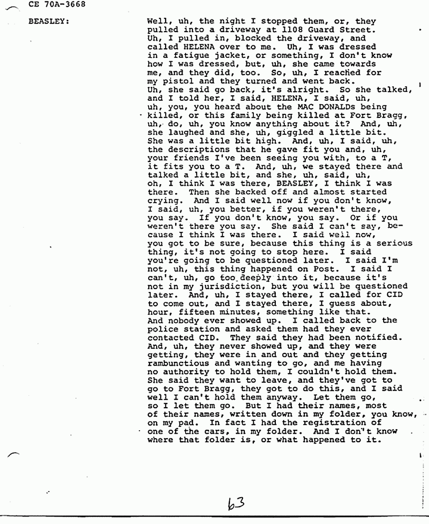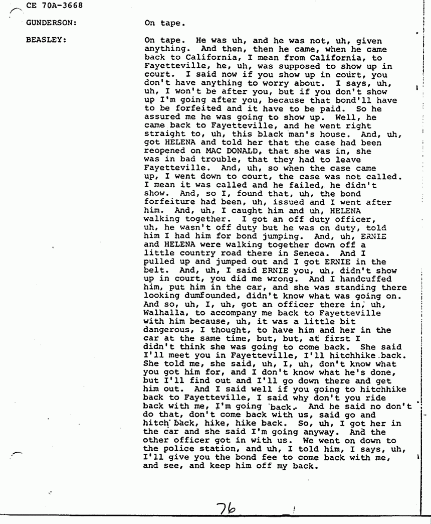 BEASLEY: On tape. He was uh, and he was not, uh, given anything. And then, then he came, when he came back to California, I mean from California, to Fayetteville, he, uh, was supposed to show up in court. I said now if you show up in court, you don't have anything to worry about. I says, uh, uh, I won't be after you, but if you don't show up I'm going after you, because that bond'll have to be forfeited and it have to be paid. So he assured me he was going to show up. Well, he came back to Fayetteville, and he went right straight to, uh, this black man's house. And, uh, got HELENA and told her that the case had been reopened on MACDONALD, that she was in, she was in bad trouble, that they had to leave Fayetteville. And, uh, so when the case came up, I went down to court, the case was not called. I mean it was called and he failed, he didn't show. And, so I, found that, uh, the bond forfeiture had been, uh, issued and I went after him. And, uh, I caught him and uh, HELENA walking together. I got an off duty officer, uh, he wasn't off duty but he was on duty, told him I had him for bond jumping. And, uh, ERNIE and HELENA were walking together down off a little country road there in Seneca. And I pulled up and jumped out and I got ERNIE in the belt. And, uh, I said ERNIE you, uh, didn't show up in court, you did me wrong. And I handcuffed him, put him in the car, and she was standing there looking dumfounded, didn't know what was going on. And so, uh, I, uh, got an officer there in, uh, Walhalla, to accompany me back to Fayetteville with him because, uh, it was a little bit dangerous, I thought, to have him and her in the car at the same time, but, but, at first I didn't think she was going to come back. She said I'll meet you in Fayetteville, I'll hitchhike back. She told me, she said, uh, I, uh, don't know what you got him for, and I don't know what he's done, but I'll find out and I'll go down there and get him out. And I said well if you going to hitchhike back to Fayetteville, I said why don't you ride back with me, I'm going back, And he said no don't do that, don't come back with us, said go and hitch back, hike, hike back. So, uh, I got her in the car and she said I'm going anyway. And the other officer got in with us. We went on down to the police station, and uh, I told him, I says, uh, I'll give you the bond fee to come back with me, and see, and keep him off my back. On the way back, an argument began between the two of them, and he said, she said I do not know why, uh, why he arrested you, what did he arrest you for. He said well I'm gonna tell you. He said I made a statement against you to TED GUNDERSON out in California about your involvement in the MACDONALD killings. And, uh, she, uh, just clammed up, she didn't say anything, she said well what did you say? And, uh, I said ERNIE, I said, uh, you're the one told her, I didn't. And, uh he said BEASLEY what did he say, what did he, uh, say I did. I said I couldn't tell you anymore what he said than I would tell him what you said. And, so, uh, they got to arguing and they got to fighting, now, almost fighting in the car. And the officer in the back had to hold ERNIE back off of her. And so on the way, uh, oh I'd say about 90 miles out of Fayetteville, she said do you still want to talk about, about the MACDONALD case. I said well, yeah, but I don't think it'd be a good idea to talk here or now. She said you better, he told her to shut her damn mouth. He said you're gonna talk yourself right into prison. She said well I'm not gonna tell them anything you that you hadn't already told them. Said I want to tell the truth about it, so you, so I'll know that you hadn't told them something that really didn't happen, or that you had amplified on something that, uh, I didn't say, or I didn't do. And, so, uh, when we got to Fayetteville, I got ERNIE out of the car, HELENA got out on the right side, ERNIE was still handcuffed with his hands in front of him, and he looked at her and said, so this is it? She said yeah and he knocked her in the head with them handcuffs, and tried to stomp her and I pulled him off of her. And, uh, we got him in jail, and uh, then I said, uh, well do you still want to talk about the MACDONALD case? She said I certainly do. She said I don't know what he has said.