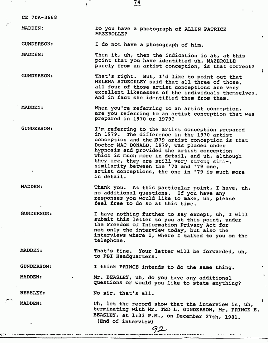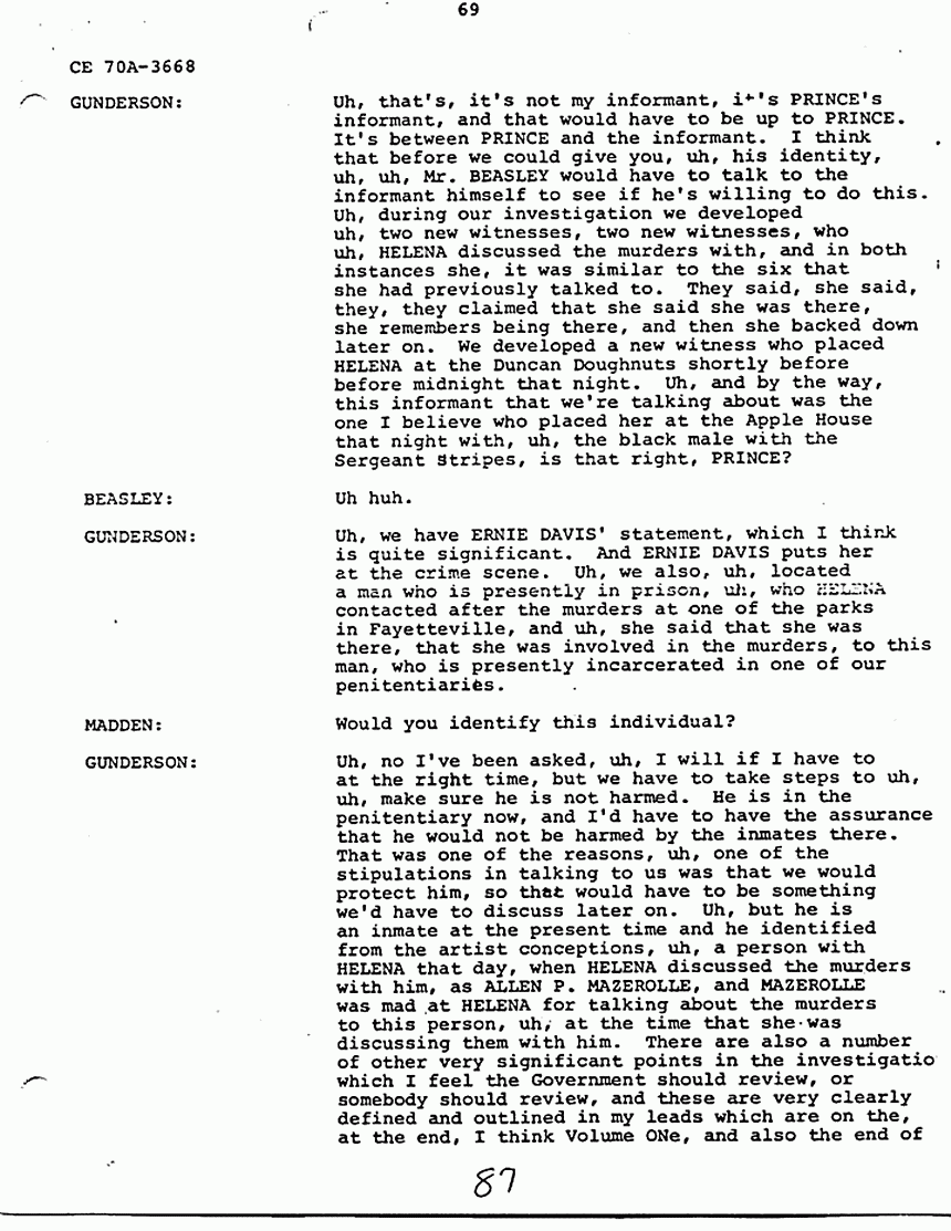 GUNDERSON: Uh, no I've been asked, uh, I will if I have to at the right time, but we have to take steps to uh, uh, make sure he is not harmed. He is in the penitentiary now, and I'd have to have the assurance that he would not be harmed by the inmates there. That was one of the reasons, uh, one of the stipulations in talking to us was that we would protect him, so that would have to be something we'd have to discuss later on. Uh, but he is an inmate at the present time and he identified from the artist conceptions, uh, a person with HELENA that day, when HELENA discussed the murders with him, as ALLEN P. MAZEROLLE, and MAZEROLLE was mad at HELENA for talking about the murders to this person, uh, at the time that she was discussing them with him. There are also a number of other very significant points in the investigation which I feel the Government should review, or somebody should review, and these are very clearly defined and outlined in my leads which are on the, at the end, I think Volume One, and also the end of Volume Four. Uh, for instance, uh, according to a University of Illinois criminologist who visited the crime scene, during the trial in 1979, evidence remains at the crime scene. There's a fingerprint on the wall above the couch, and there is a splinter of wood in the master bedroom which was never taken into evidence by the Government. There is also a closet full of candles labeled evidence which are sitting out there, were sitting out there at the time. Those are the points I'd like to make. There are a number of other points, uh, I can make, but I won't at this time in the interest of, uh, brevity and uh, but everything is very well outlined in the report, which you have in your possession.