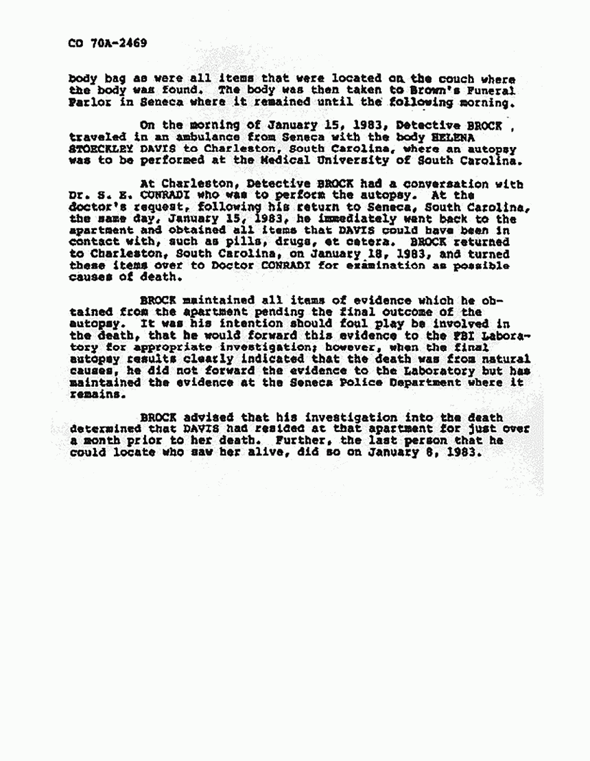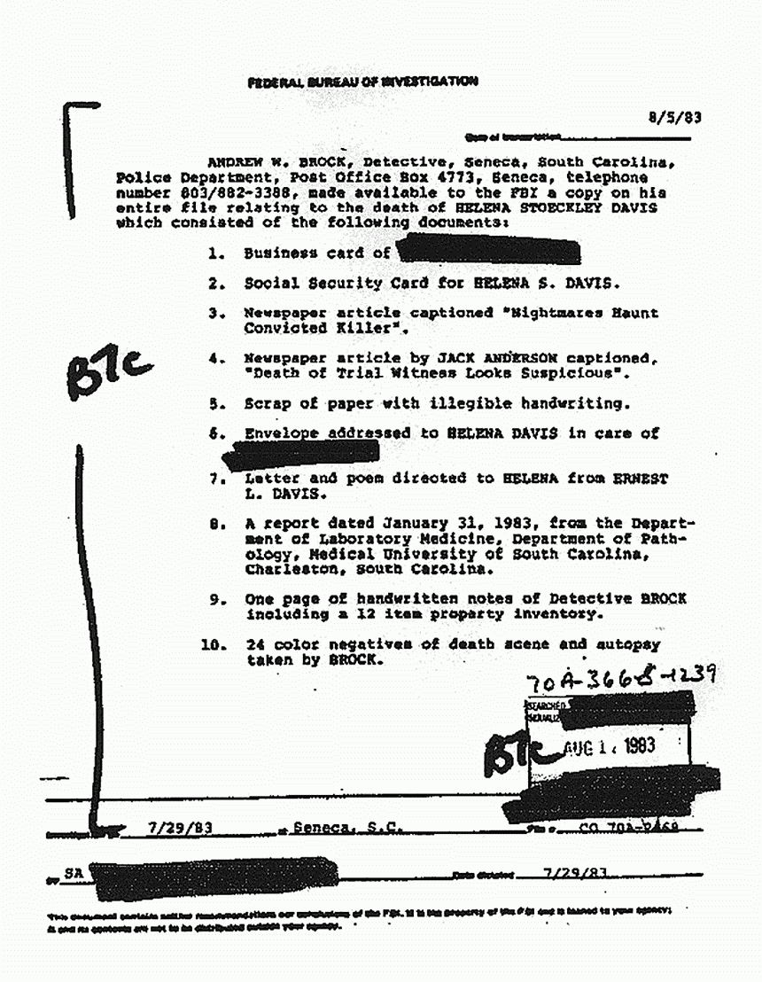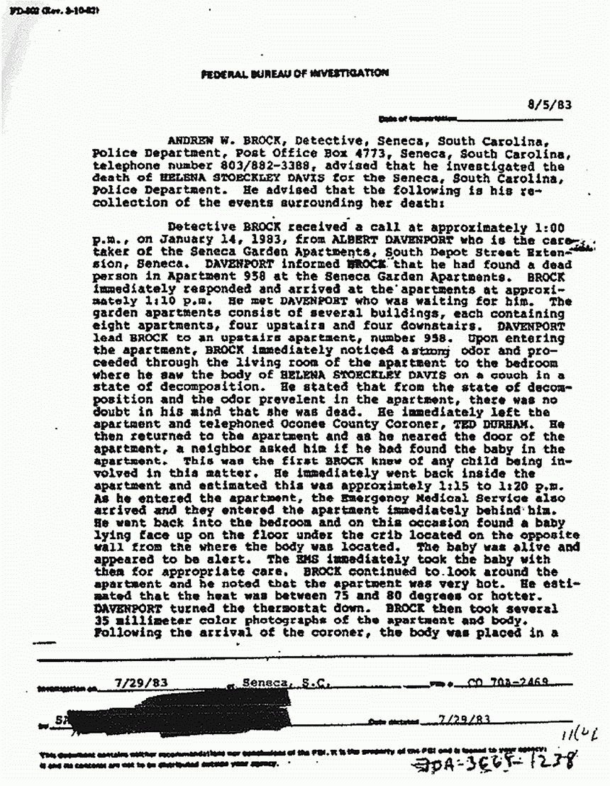 FBI File re: July 29, 1983 interview of Det. Brock re: death of Helena Stoeckley