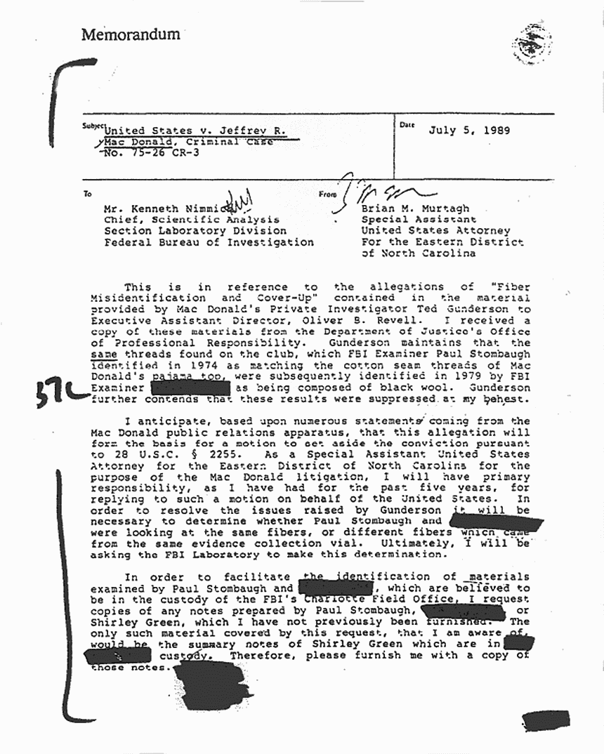 Memorandum from Brian Murtagh to Kenneth Nimmich (FBI) re: Ted Gunderson's Allegations of Fiber Misidentification and Cover-Up