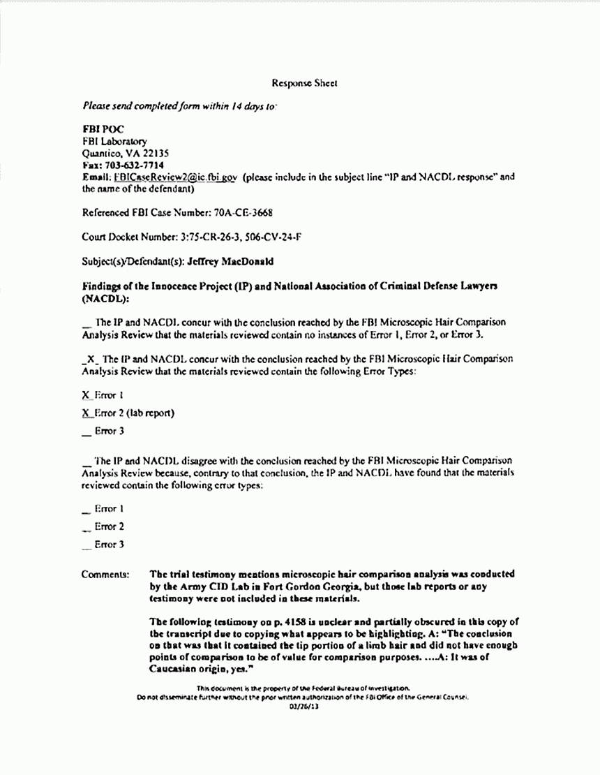 Feb. 4, 1991: Report of FBI Laboratory (Michael Malone)