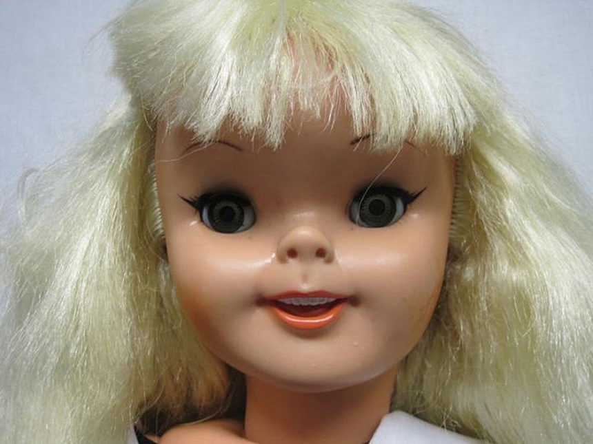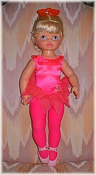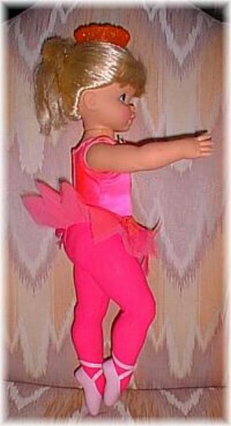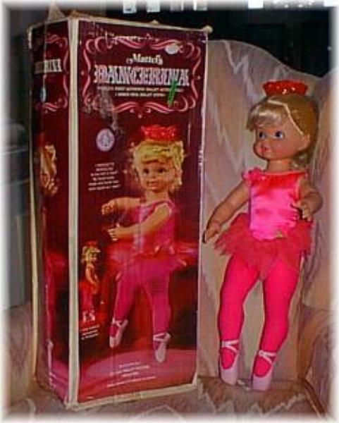 Dancerina doll, by Mattel. Intruduced in 1968. 24" tall. Pirouettes via activation of a knob in the plastic crown; turns in either direction and can also dance in place on tip-toe. This doll came with a plastic record with dance music to be played on a regular record play (33 1/3 rpm).