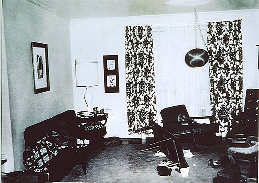 East wall (on left) in living room (before investigators placed clothes from steps on sofa)
