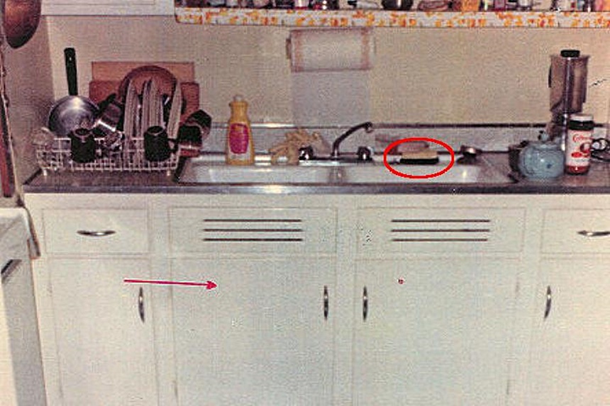 Kitchen sponges (top right edge of sink, under bottle brush, circled by webmaster)
