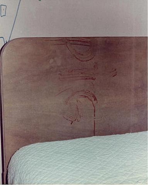 W5 Headboard, blond wood, bearing handprinting in suspected blood