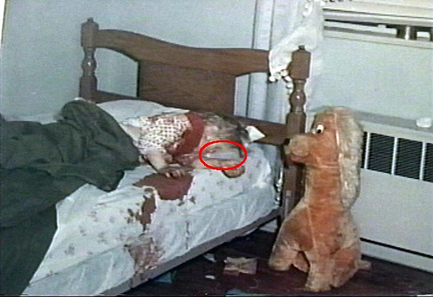 Plastic baby bottle (circled by webmaster) near mouth of Kristen MacDonald