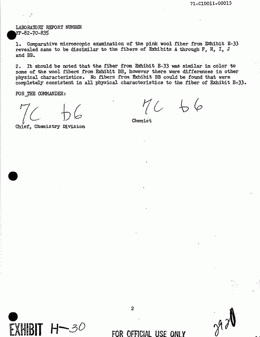 ![]() Comparitive microscopic examination of fibers removed from items present in the house at 544 Castle Drive, Ft Bragg, N.C. and items relating to this case, present in the evidence room at the CID Office, Ft Bragg, N.C., did not reveal same to be similar in physical characteristics to the fiber of Exhibit E33. |