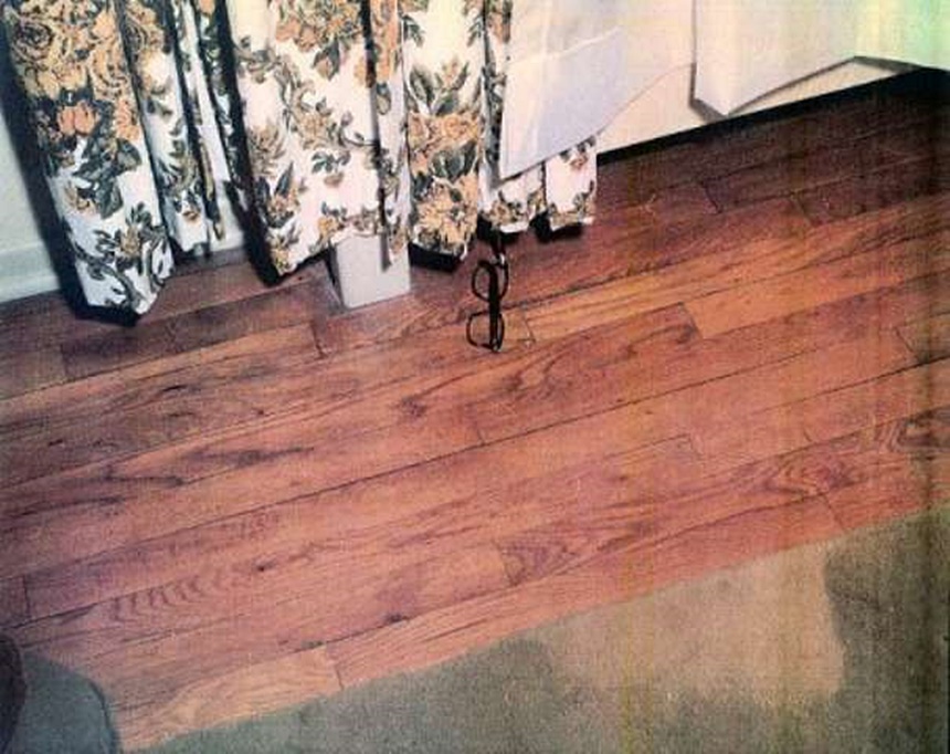 D33 | Red-brown stain from eyeglasses found on floor of living room |