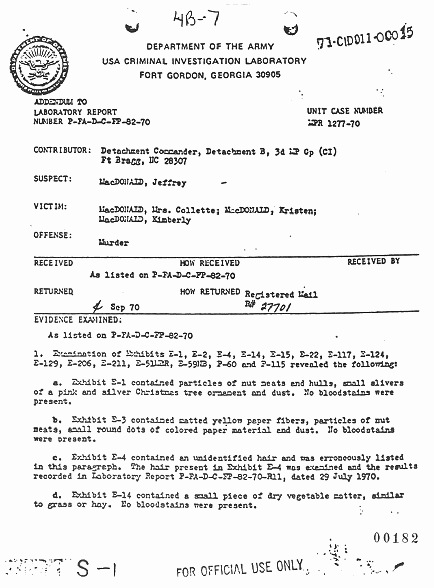 ![]() Paragraph 1: c. Exhibit E4 contained an unidentified hair and was erroneously listed in this paragraph. The hair present in Exhibit E4 was examined and the results recorded in Laboratory Report P-FA-D-C-FP-82-70-R11, dated 29 July 1970. |