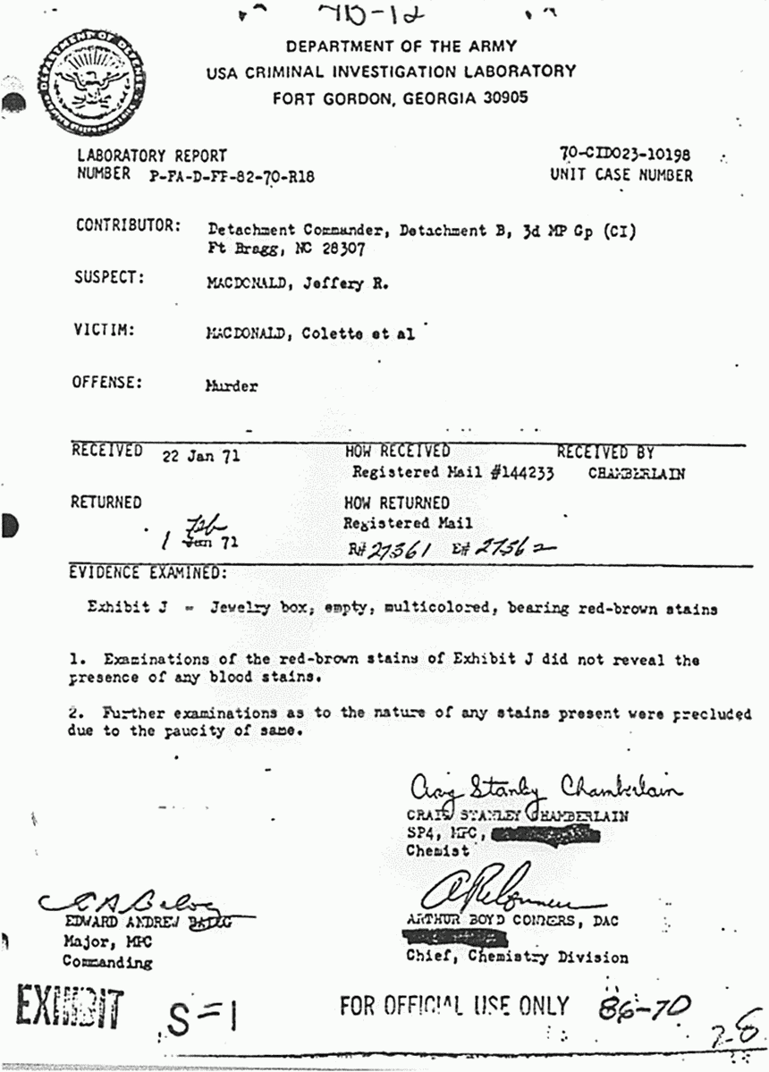 Paragraph 3: Examination of Exhibit J revealed one latent fingerprint and one latent palm print suitable for identification. Paragraph 11: The remaining latent prints were not identified. However, due to lack of complete clarity in some areas of the record finger and palm prints of Cpt. and Mrs. MacDONALD, a complete elimination/identification could not be made. Webmaster note: For clarification regarding the "remaining latent prints" referenced in this excerpt, see page 26 |