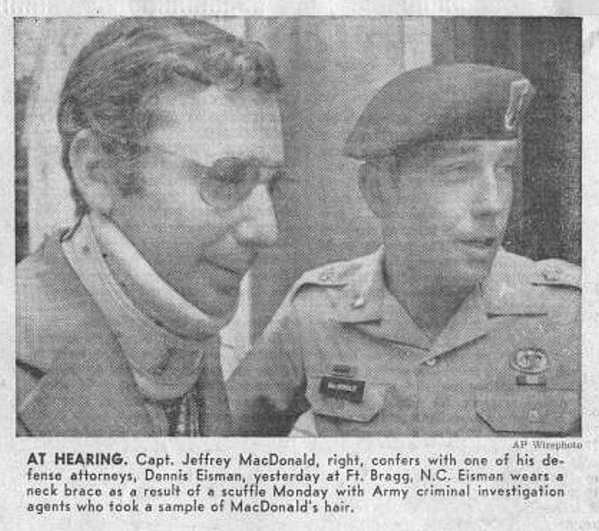 Kenneth Mica, one of the first MPs to enter the murder scene. He later claimed to have seen a girl matching the description of the female intruder, standing on a street corner in the early morning hours as he drove to 544 Castle Drive. 1968: High school photo of Helena Stoeckley and twin brother Clarence 1969: Senior year high school photo of Helena Stoeckley Spring 1970: Photograph of Helena Stoeckley, taken at the police station a few weeks after the murders Photograph of Helena Stoeckley, ca. 1970-1971 August 17, 1979: Helena Stoeckley with U.S. Marshal Jimmy Britt August 17, 1979: Helena Stoeckley with U.S. Marshal Jimmy Britt Photograph of Greg Mitchell (July 6, 1950 - June 3, 1982). Named by Helena Stoeckley as a suspect. Mitchell gave voluntary statements to the Army CID (1971) and to the FBI (1981), passed a polygraph test in 1971, and was ultimately cleared of any involvement in the case. Photograph of Greg Mitchell (3rd from left) and Army buddies. Named by Helena Stoeckley as a suspect. Mitchell gave voluntary statements to the Army CID (1971) and to the FBI (1981), passed a polygraph test in 1971, and was ultimately cleared of any involvement in the case. July 24, 1970: Col. Robert Kriwanek (Provost Marshal, Ft. Bragg, N.C.) during the Article 32 hearing 1970: Attorneys Dennis Eisman and Bernard Segal after an altercation involving the taking of hair samples from Jeffrey MacDonald, which MacDonald had refused to provide. July 23, 1970: Jeffrey MacDonald and Dennis Eisman during the Article 32 hearing Circa July 1970: Jeffrey MacDonald holds attorney Dennis Eisman's son Circa July 1979: Attorney Bernard Segal in his office during the trial Attorney Bernard Segal, ca. 1979 1979: Freddy and Mildred Kassab with some of the investigators July 19, 1979: Freddy and Mildred Kassab on the first day of trial 1979: Freddy and Mildred Kassab 1979: Freddy and Mildred Kassab Reinvestigation team, circa 1971, L-R: Mike Pickering, Peter Kearns, Dick Mahon and Bill Ivory 1979: Judge Franklin Dupree, <em>U.S. v. MacDonald</em> 1979: Judge Franklin Dupree, <em>U.S. v. MacDonald</em> August 3, 1979: Jeffrey MacDonald (left), Bernard Segal (center) and Jim Blackburn (right, in sunglasses) outside 544 Castle Drive during the jury's visit.<br><br>At far left, in glasses, prosecutor Brian Murtagh is partially visible. August 3, 1979: Defense attorney Wade Smith (far left) watches as jurors enter 544 Castle Drive August 3, 1979: Spectators outside of 544 Castle Drive during the jury's visit August 3, 1979: After the jury's visit to 544 Castle Drive, Bernard Segal grins broadly as Jeffrey MacDonald talks, laughs and shakes hands with spectators.<br><br>In the words of Joe McGinniss in <em>Fatal Vision,</em> MacDonald "was surrounded by a throng of excited housewives and smiling children who called out words of encouragement. Some of the children even rushed forward to shake his hand... It was nice, he said...It was the first time in nine and a half years that he had made physical contact with a child on Castle Drive...He appreciated such signs of support. The children waved at him as he departed." 1979: Prosecutor Brian Murtagh, <em>U.S. v. MacDonald</em> 1979: Prosecutor James Blackburn, <em>U.S. v. MacDonald</em> 1979: Prosecutors Brian Murtagh and James Blackburn (<em>U.S. v. MacDonald</em>) at news conference 1979: Prosecutors Brian Murtagh and James Blackburn (<em>U.S. v. MacDonald</em>) at news conference Paul Stombaugh testified for the prosecution at trial on August 7, 8 and 9, 1979 John Thornton testified for the defense at trial on August 14, 1979 John Thornton testified for the defense at trial on August 14, 1979 Circa July 1979: Jeffrey MacDonald and Bernard Segal arrive at the Raleigh, N.C. Federal Courthouse for the trial. MacDonald's mother, Dorothy, can be seen in the background (with purse). 1979: Defense attorneys Wade Smith (L) and Bernard Segal (R), <em>U.S. v. MacDonald</em> Wade Smith, defense co-counsel, in later years Circa July 1979: Joe McGinniss (author of <em>Fatal Vision)</em> Circa July 1979: Joe McGinniss (author of <em>Fatal Vision)</em> Ted Gunderson Oct. 6, 1989: Judge Franklin Dupree (<em>U.S. v. MacDonald</em>) enjoying himself at a ceremony.<br><br>Photo: Chris Seward, <em>Raleigh News & Observer</em>. Jeffrey MacDonald's second-chair defense attorney at the 1979 trial, Wade Smith (left), prosecutor James Blackburn (center), and Joe McGinniss (right), author of <em>Fatal Vision</em>, pose for a group photo in 1993. 1996: Former U.S. Marshal Jimmy Britt<br>File photo: The <em>Raleigh News & Observer</em> James Blackburn