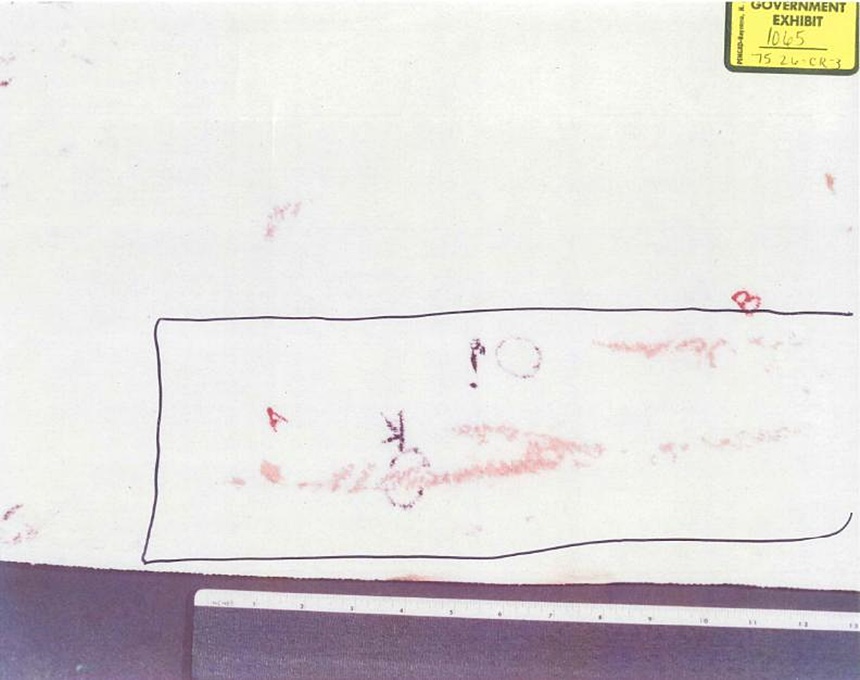 Paul Stombaugh compared the shapes of the Old Hickory knife and the ice pick to the bloody impressions on the bathmat, and concluded that the two weapons were set down and subsequently wiped on the bathmat. The opposite side of the bathmat bore bloody smudges which, according to Stombaugh, resembled handprints. In Stombaugh's opinion, however, the potential handprints were not as clearly defined as the bloody handprints found on the blue bedsheet.