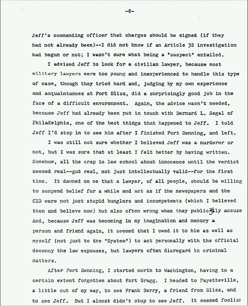 July 6, 1971: Journal of Michael Malley re: his "last uncolicited interference" with the MacDonald case, p. 8 of 102