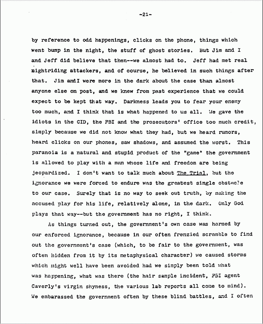 July 6, 1971: Journal of Michael Malley re: his "last uncolicited interference" with the MacDonald case, p. 21 of 102