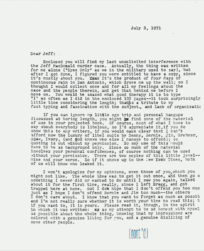 July 6, 1971: | Michael Malley's journal re: his "last unsolicited interference" with the Jeffrey MacDonald murder case |