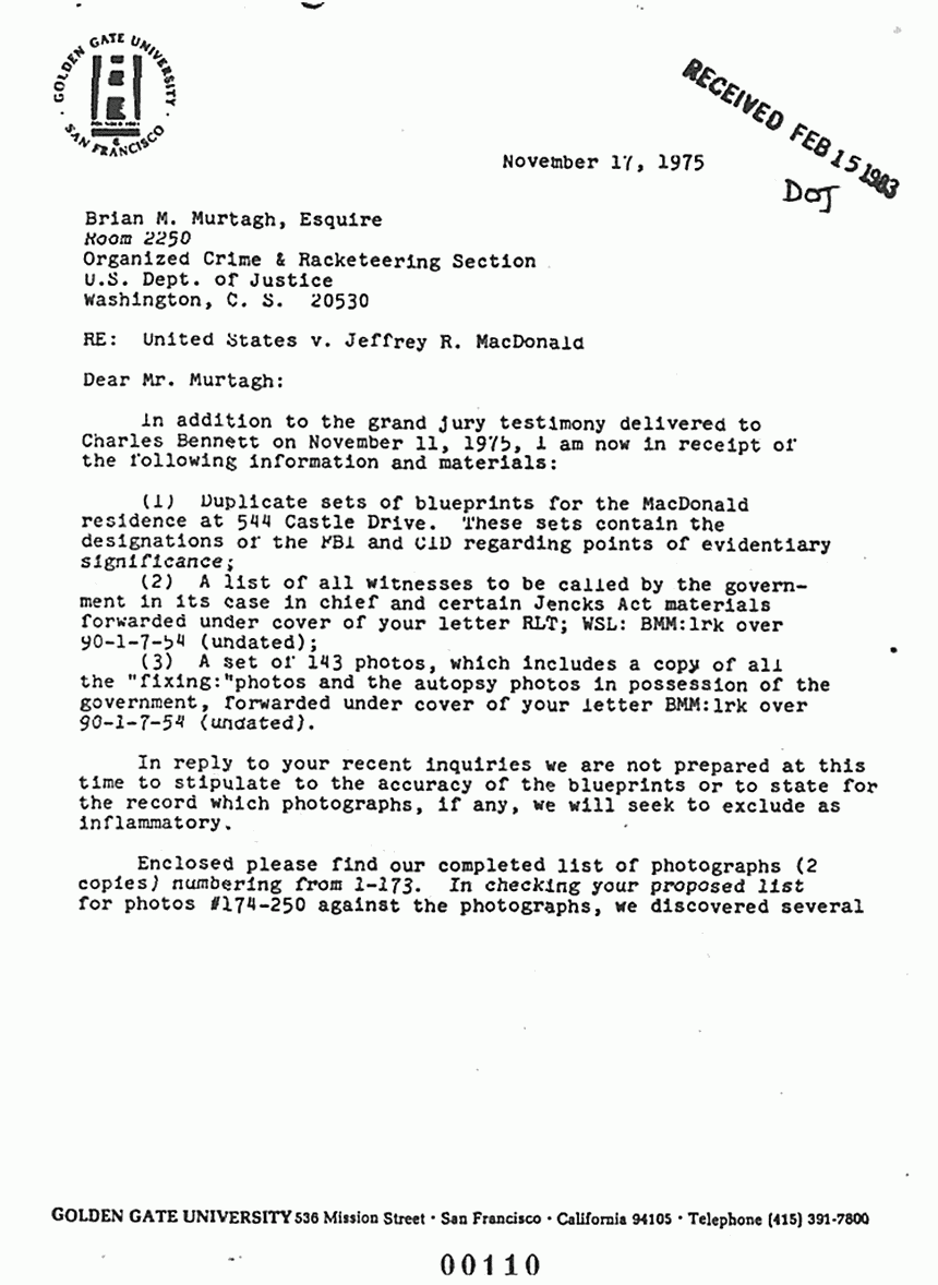In addition to the grand jury testimony delivered to Charles Bennett on November 11, 1975, I am now in receipt of the following information and materials: