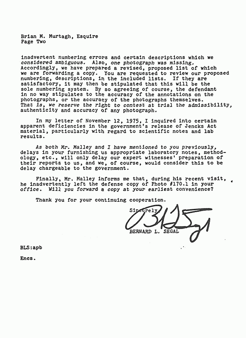 Finally, Mr. Malley informs me that, during his recent visit, he inadvertently left the defense copy of photo #170.1 in your office. Will you forward a copy at your earliest convenience?