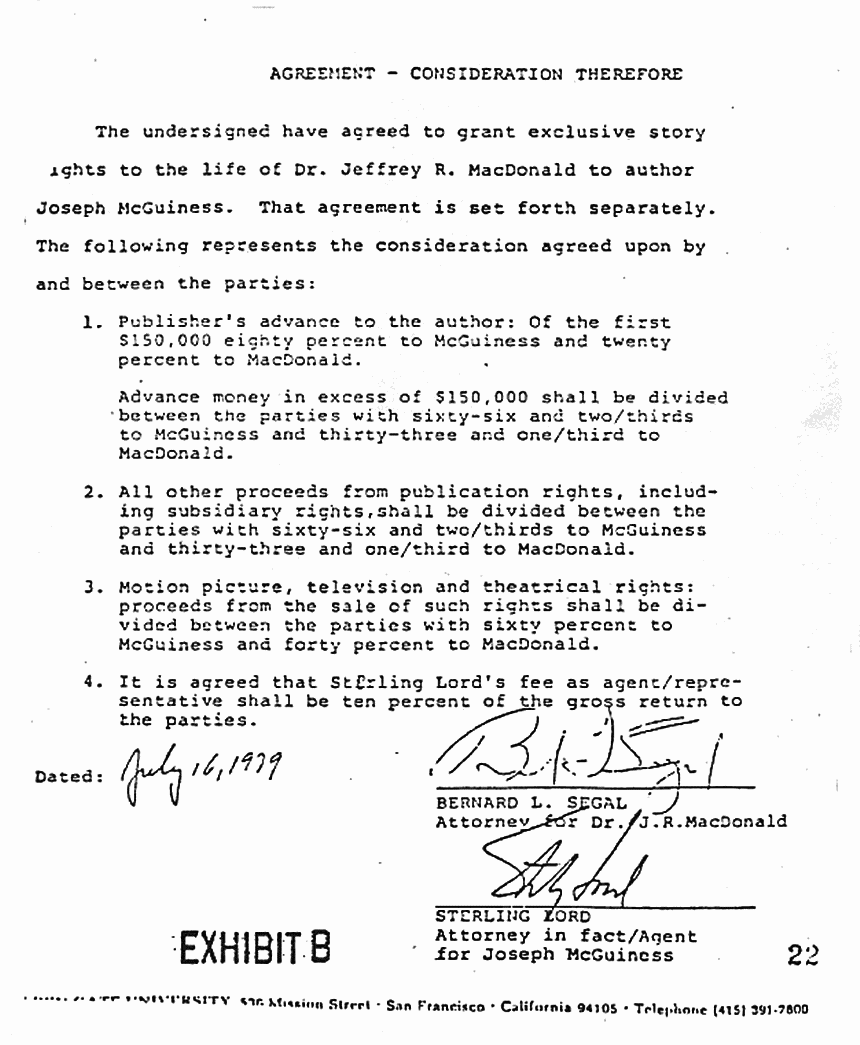 Agreement between Bernard Segal (for Jeffrey MacDonald) and Sterling Lord (for Joe McGinniss) for Consideration re: story rights for