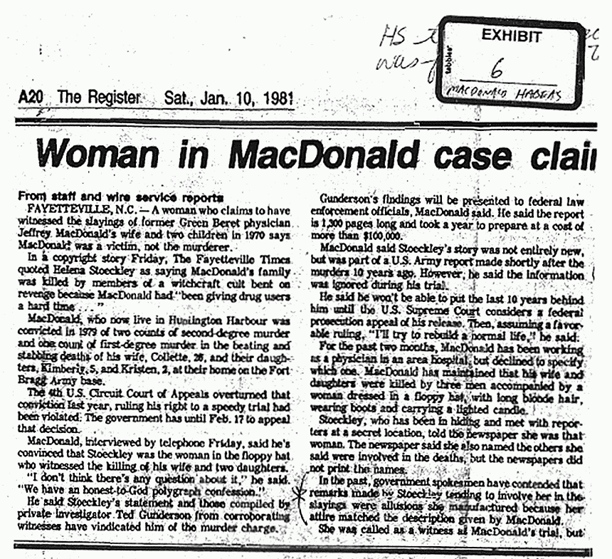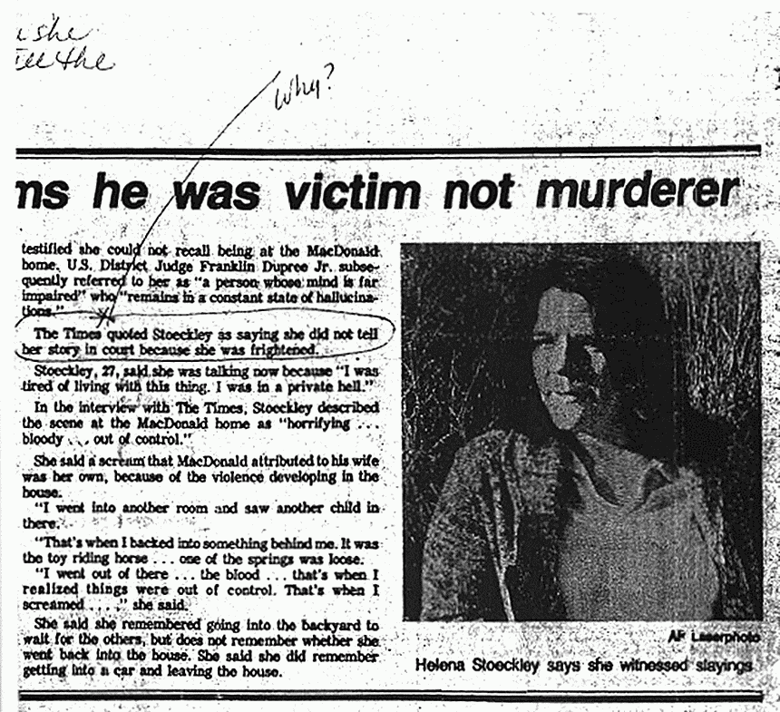 Newspaper Article: "Woman in MacDonald Case Claims He Was Victim Not Murderer,"